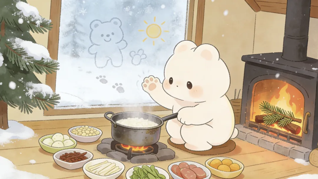 松松戳了戳小火苗,火苗晃了晃,好像在安慰他。他把糯米和红豆先倒进锅里,清水立刻裹住了圆润的米粒,慢慢飘起淡淡的米香。他又放了桂圆和栗子,用小木勺轻轻搅着,锅里的热气袅袅升起,模糊了窗玻璃,松松用小爪子在玻璃上画了个圆圆的小太阳,又画了一只胖胖的小熊,歪歪扭扭的,像阿糯平时笨笨的样子。