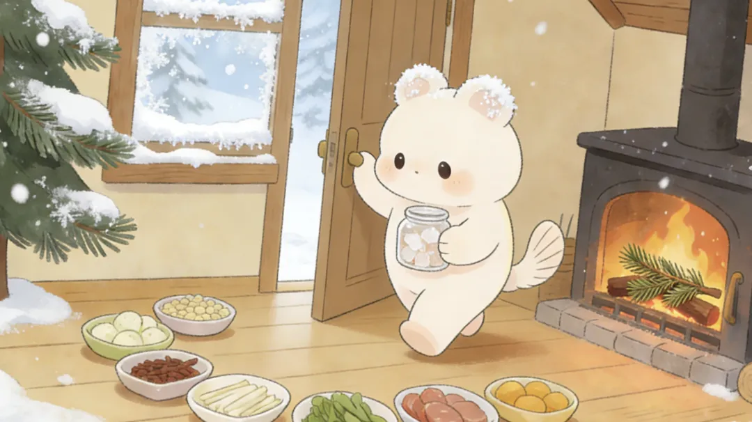 就在他耷拉着尾巴,快要趴在锅边睡着的时候,树屋的小木门被轻轻推开,带着一身雪香的阿糯走了进来,他的耳朵上沾着雪花,鼻尖红红的,手里还攥着一个小小的玻璃罐,罐子里装着亮晶晶的东西,在暖黄的灯光下,像星星在闪烁。