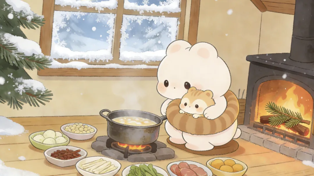 阿糯搬了小凳子,坐在松松身边,和他一起守着锅,炉火噼啪响,粥咕嘟咕嘟冒泡,窗外的雪静静落,屋里的光暖暖的。阿糯把松松的小爪子捂在自己掌心里,松松的爪子软软的,阿糯的手掌暖暖的,两人靠在一起,不说什么,就觉得心里满满的,甜甜的。