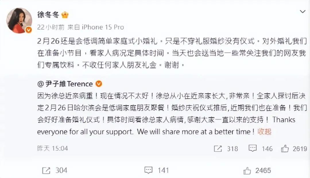 没想到却发生意外,近日准新郎尹子维,在其社交平台上发声,声称徐冬冬的近亲病重,他们经过协商及讨论,最终决定2月26日的婚礼,改成仅邀请亲友低调聚餐。