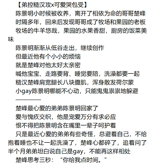主角受被工作中遇到的一个人渣污蔑而遭到他粉丝的网暴迫害,心灰意冷下回到了他哥哥的农场。他哥哥因为小时候没有能力领养受和受分离十三年,对此他一直抱有愧疚的心,认为是他的原因让受这些年过得不好,他把受接回来立志要好好补偿他,完全是放在心尖上宠,一口一个宝宝叫的。逐渐把受养回了小时候活泼开朗的小太阳性格。奈何是个纯直男,把受搞得下手也不是不下手也不是,于是终于决定向他坦白自己是同,然后攻沉默了一会很快就接受了,自我洗脑说没事,自己会调理好的把自己也变同的。这里我真的要笑死。