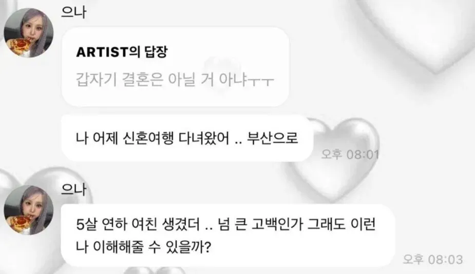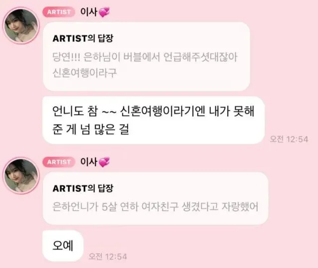 更绝的是Isa的回应。她在自己的Bubble里接话:“姐姐说‘度蜜月’有点夸张啦……我做得还不够,收到的宠爱倒是太多了。” 被粉丝追问恩河说的“小五岁女朋友”时,她干脆回了句“哦是的”,