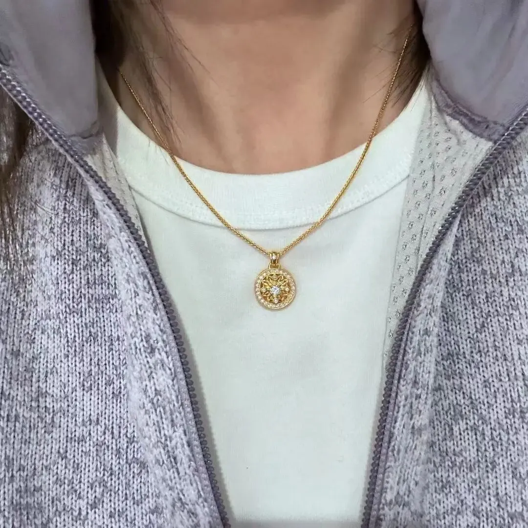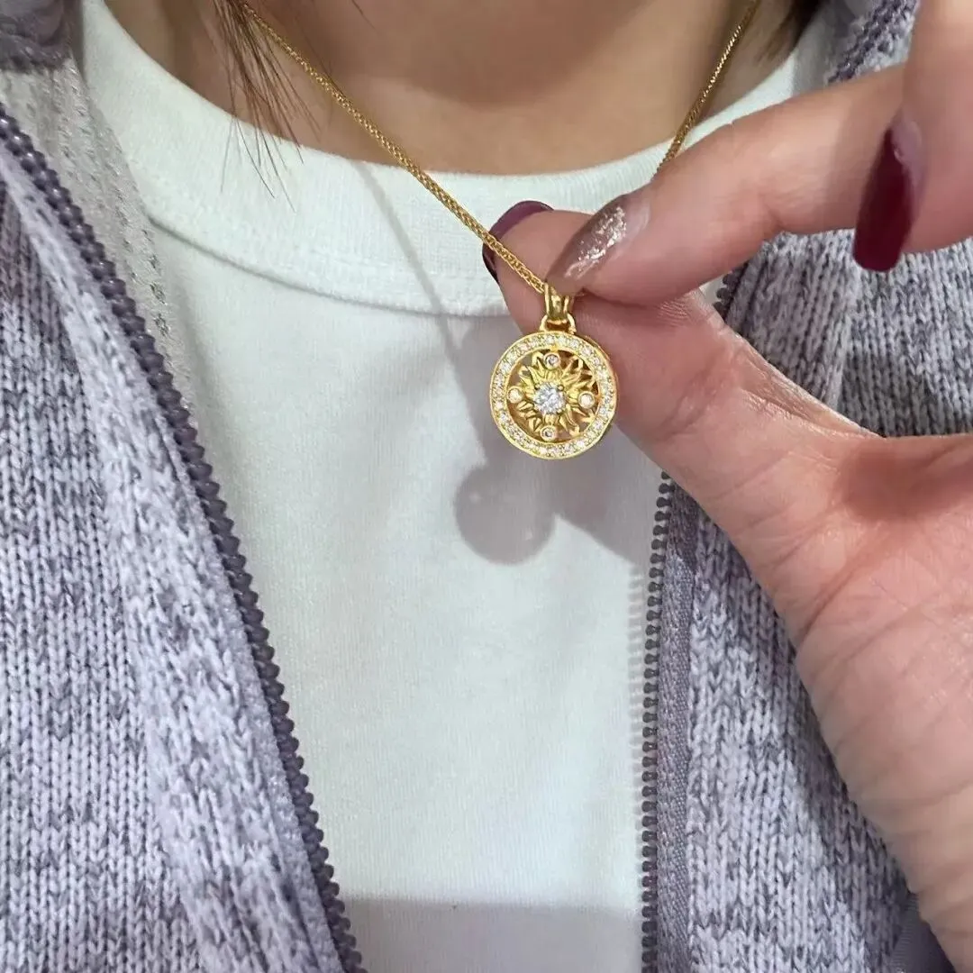 不是说我多在乎那点钱,而是三金对于女生来说,哪里只是几件黄金首饰啊分明是订婚的仪式感,是男方家对这个婚事对我的重视程度啊。我之前还特意拉着闺蜜去好几家金店试戴对比过,早就一眼看中一款足金的锁骨链,是那种简约的小太阳吊坠,边缘打磨得很光滑摸着特别有质感,重量大概8.7克左右。戴着不厚重也不张扬贴在脖子上刚刚好还特别显白,能衬得人气质很温柔,不管是搭小裙子还是日常通勤穿的衬衫针织衫都好看。当时我还跟闺蜜说,这就是我想要的订婚项链。