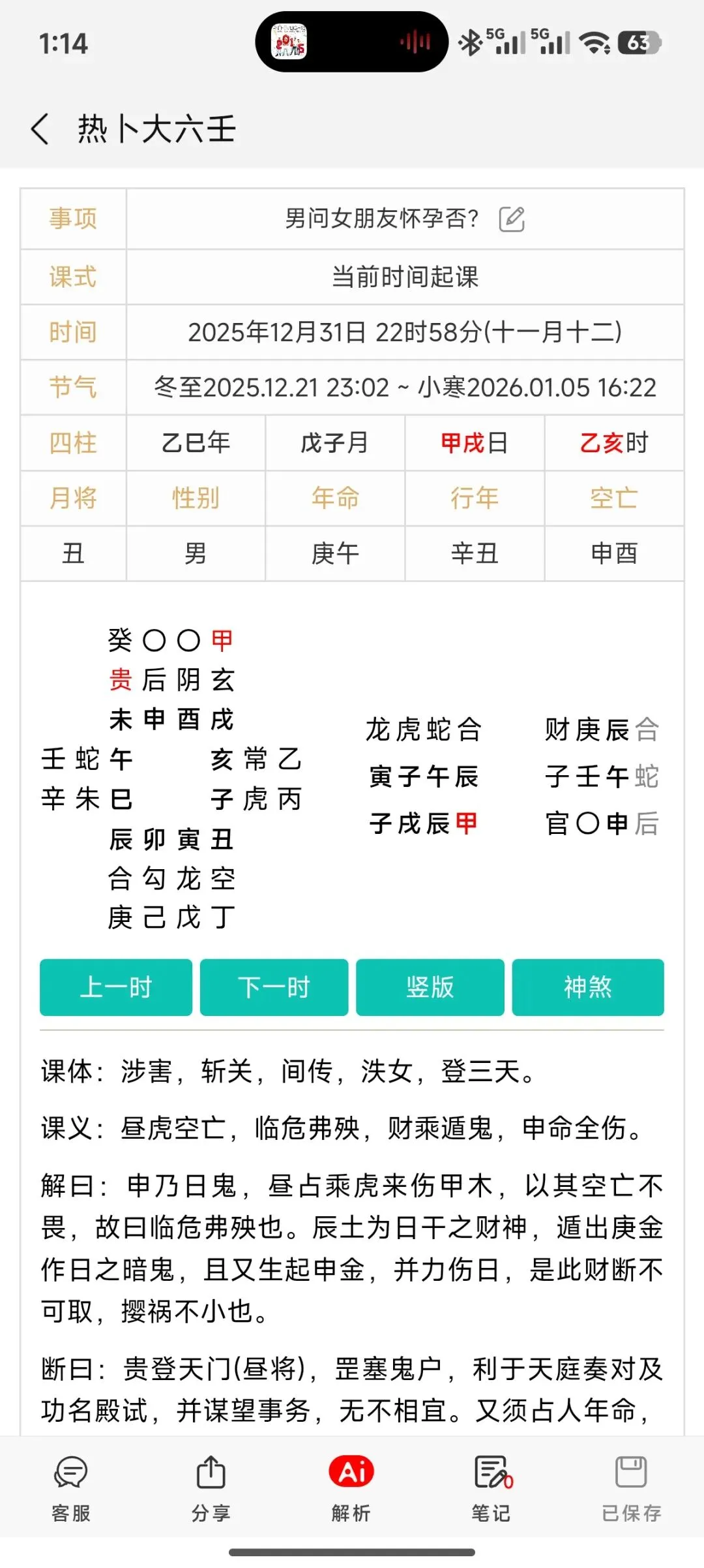 个人解析:日干胎在酉,酉空亡。且丑为肚子,乘天空,肚子里面没东西,两象结一象,所以没有怀孕。