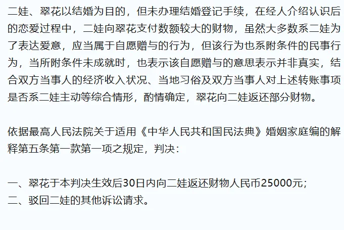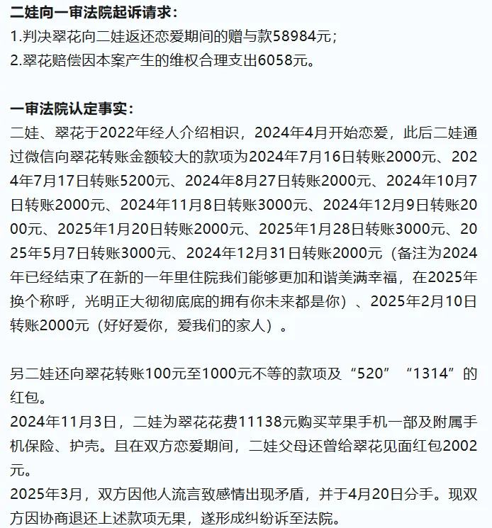 其次,恋爱关系的维系与付出是双向的,不仅限于金钱。翠花在恋爱期间亦可能投入了时间、情感等无形付出。一审判决未支持全额返还,正是为了避免因单纯计算金钱往来而导致对受赠方在恋爱关系中正当权益的忽视。