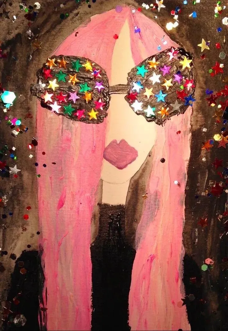 因此周末特意把头发染成了染成了灰蓝色,在灰蓝色上面又斑驳地分布了几块粉色、绿色、紫色和黄色。两只耳朵累计有7个耳洞,都戴上了形状各异的彩色环钉,眼尾抹了一小指绿色珠光眼影,眼尾飞出一条浅蓝色的眼线。上衣是类似三宅一生的高饱和度彩色褶皱上衣,但来自打版的网红品牌,穿着自制的chopova lowena百褶半裙和淘宝上买的假kiko kostadinov蝴蝶结靴,配了一双深紫色的网纹丝袜,拎了一个二手网站上淘来的的麂皮MiuMiu,边角已经磨得微微冒出油光,十根指头、一根脖子已经挂得叮当作响、满满当当,还是觉得不够喧嚣,又找出在手工展览上买的豌豆改造的饰品挂在包上。还是少,宋罗青心想,又自作主张地别了两包魔芋爽上去。