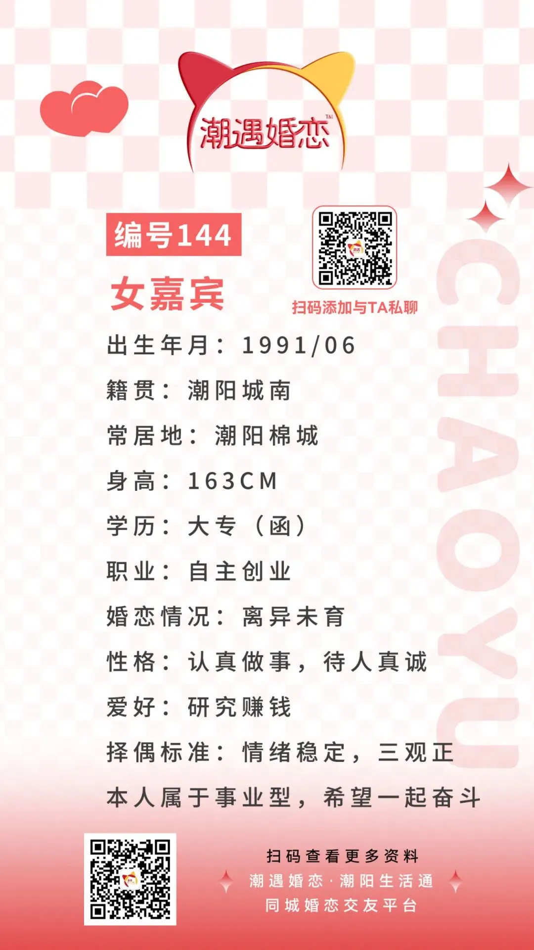 【潮遇婚恋】嘉宾:编号144号女嘉宾 ·职业自主创业,身高163~