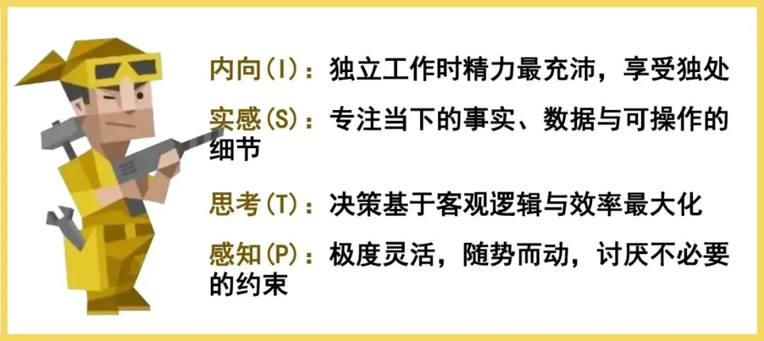 说起来黄人组(SP型)也只还剩下一个人格没讲了,本期就来聊一聊这个据说在婚恋平台“很不讨好”的人格——ISTP。
