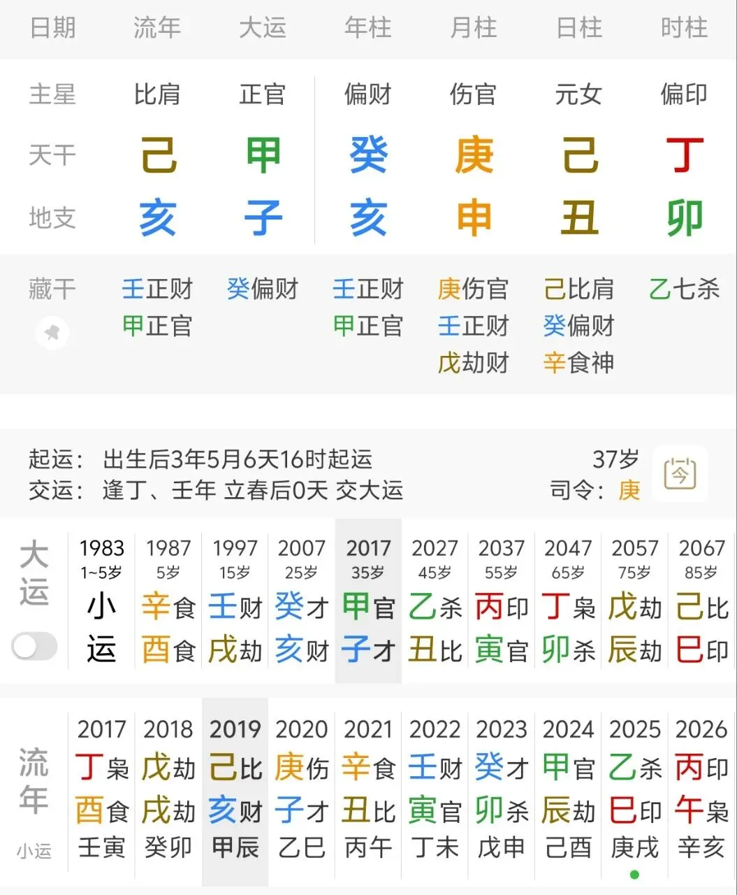 甲子大运甲木透出,2019己亥年,己土合甲木为应期结婚,但是夫妻宫的问题还是没有改变,后面无不对夫妻宫进行着搅动,最终因为破产(这个命盘亥子丑前面写过,会有破财象)23年彻底离婚。(目前负债几十万,带俩孩子)
