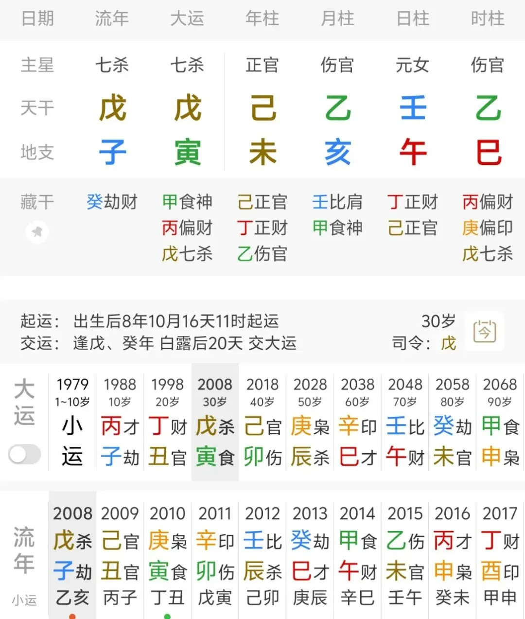 2008年戊土夫星透出,可以以戊为主看,因为己土状态挺差(乙冲己)。