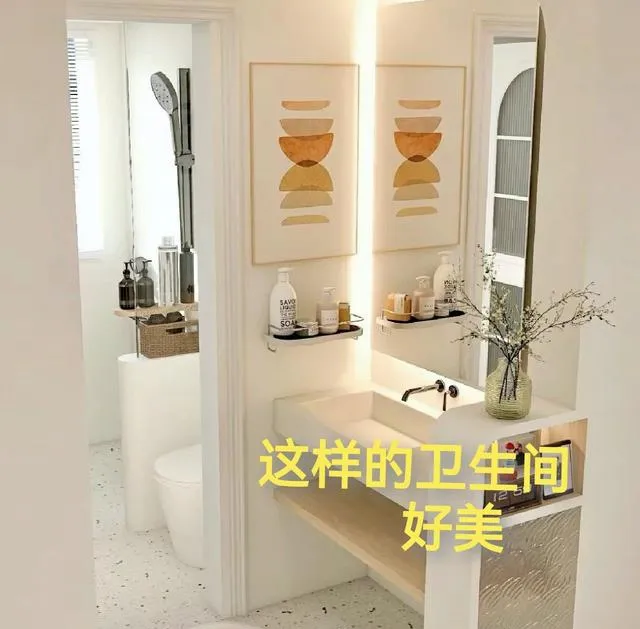 你看这第一张图,那叫一个清新雅致!洗脸盆挪到外面,配上抽象艺术画和精致的小摆件,整个空间立刻就有了档次。镜子旁边放着洗手液、护手霜,随手就能用,方便得很。