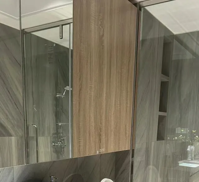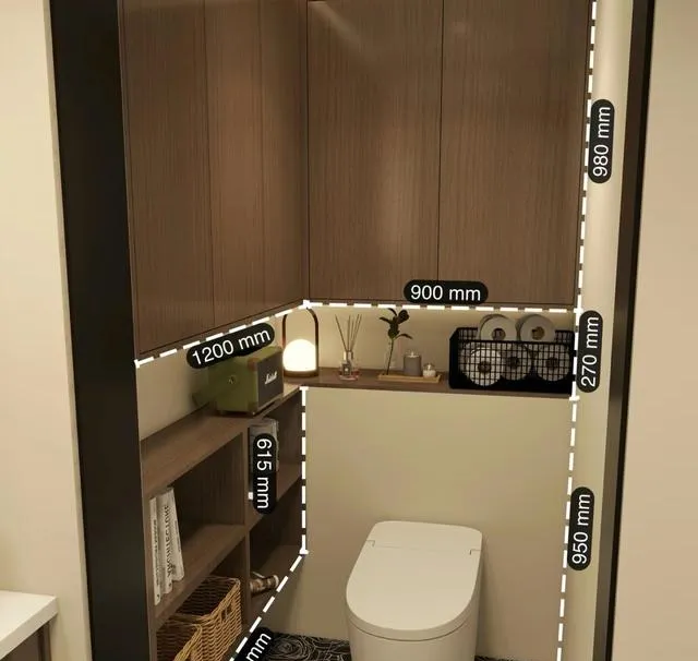 这时候可以在马桶后方做一整面镜柜,从顶到底,收纳能力那叫一个强!洗漱用品、毛巾、卫生纸,全部都能收进去,卫生间立刻就干净整洁了。