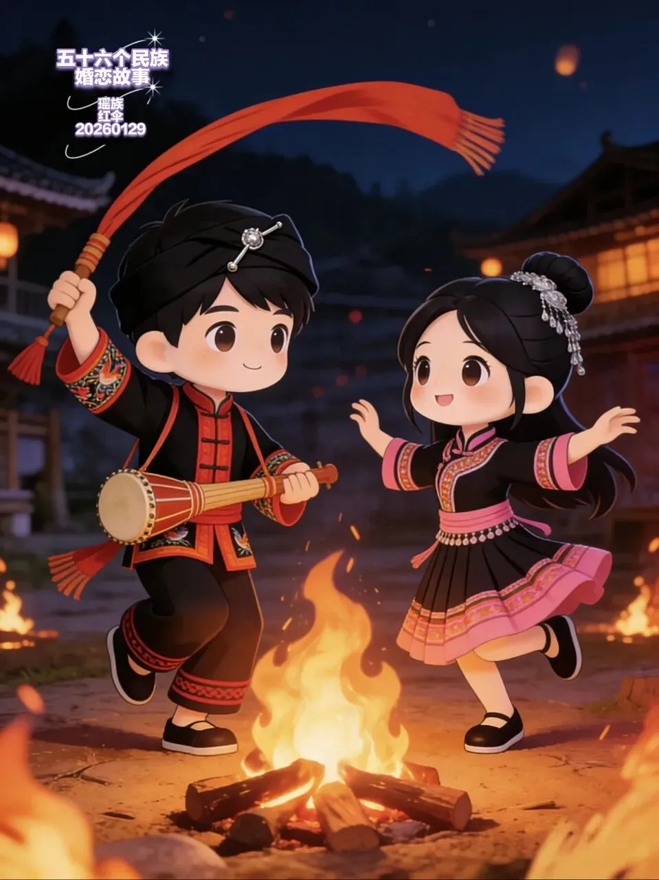 桐树下的空地上,篝火已经点燃。阿明率先起舞,长鼓在他手中上下翻飞,红绸带如火焰般在空中旋舞。鼓点时而激越如瀑,时而轻柔似风,每一次鼓槌落下,都像在叩问阿妹的心意。阿妹犹豫片刻,终于踩着鼓点踏入火光照亮的圈子。她的脚步轻盈,裙摆随着鼓点旋出好看的弧度,与阿明的红绸带相映成趣。