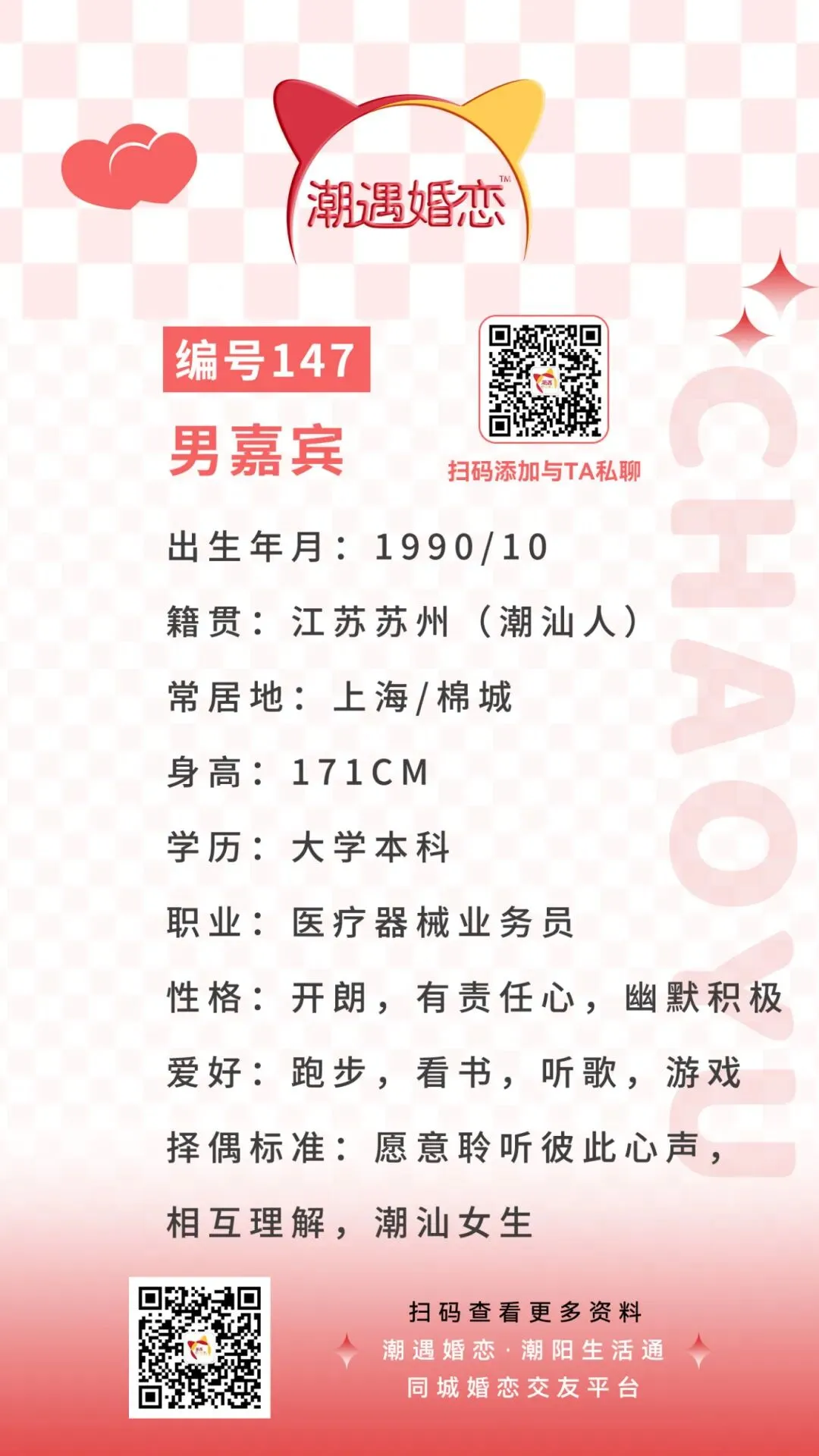 诚意想与嘉宾认识的可扫码联系潮遇红娘牵线,将本期嘉宾的编号/交友卡片发送给潮遇红娘,开启心动模式,与嘉宾微信聊天深入了解哟!