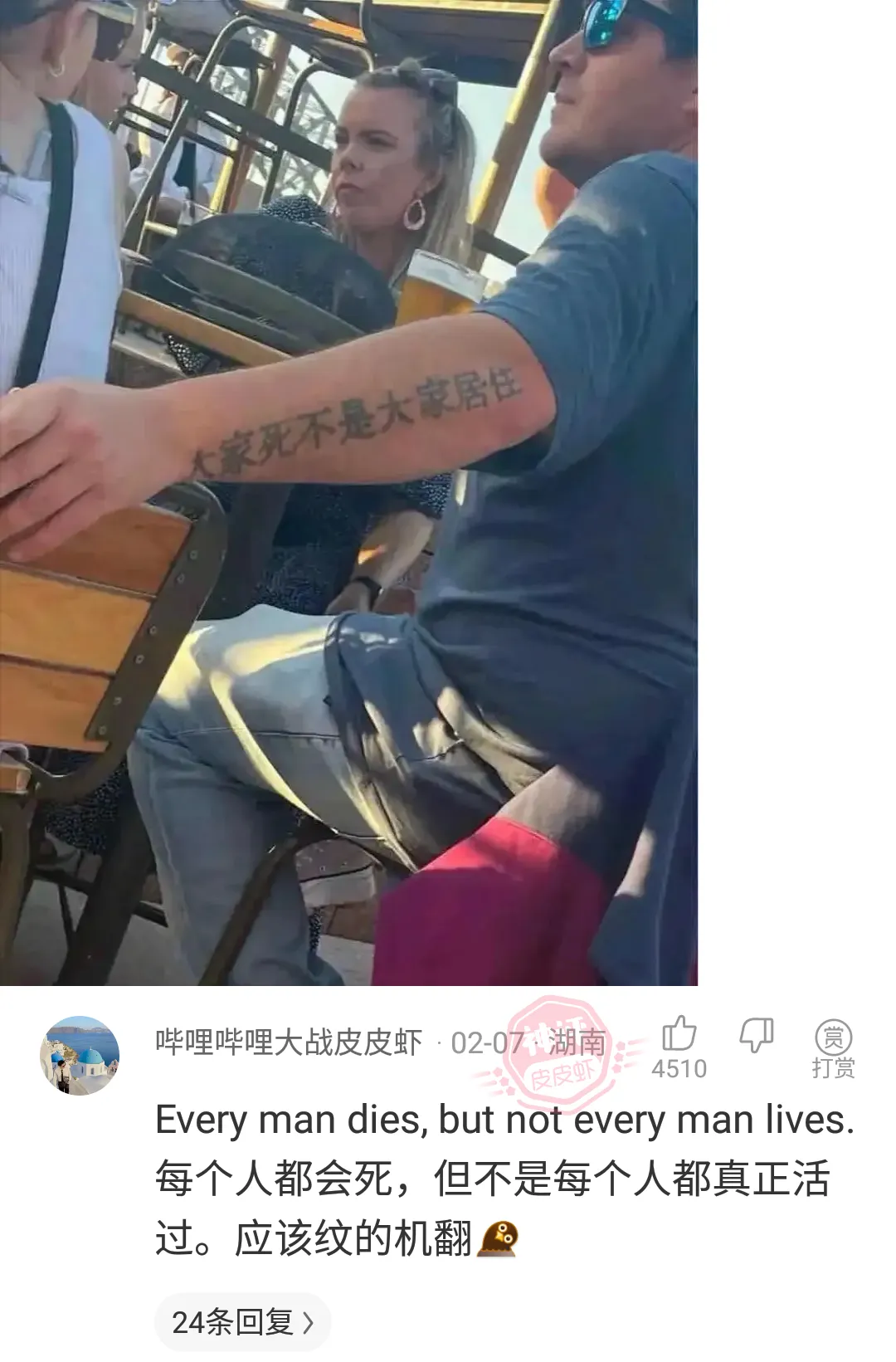 神回复:Everymandies,butnoteverymanlives.每个人都会死,但不是每个人都真正活过。应该纹的机翻....................................................................................................