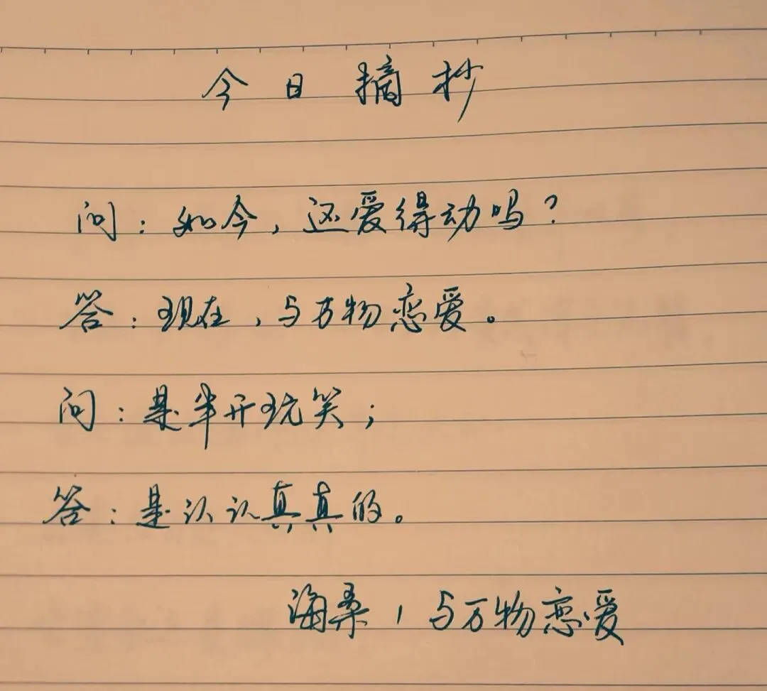 与万物恋爱,只能是这样。爱具体的事物,单个的人,把人类当作个体来爱。用恋爱的方式,与世界保持联系,世界不是他者,所有的存在,只是你和我,一对一,面对面,我永远不会转过身去。