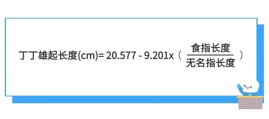 结果发现:两者右手比值低的男性,其勃起状态下的丁丁较长。研究者表示,这是因为在胎儿时期体内所产生的雄性激素,会同时影响手指的发育状况和丁丁的长度。而之所以选择右手,是因为右手手指对雄性激素的影响更敏感。说了那么多,为了防止被说标题党,云妹给大家找了个丁丁长度的计算公式:
