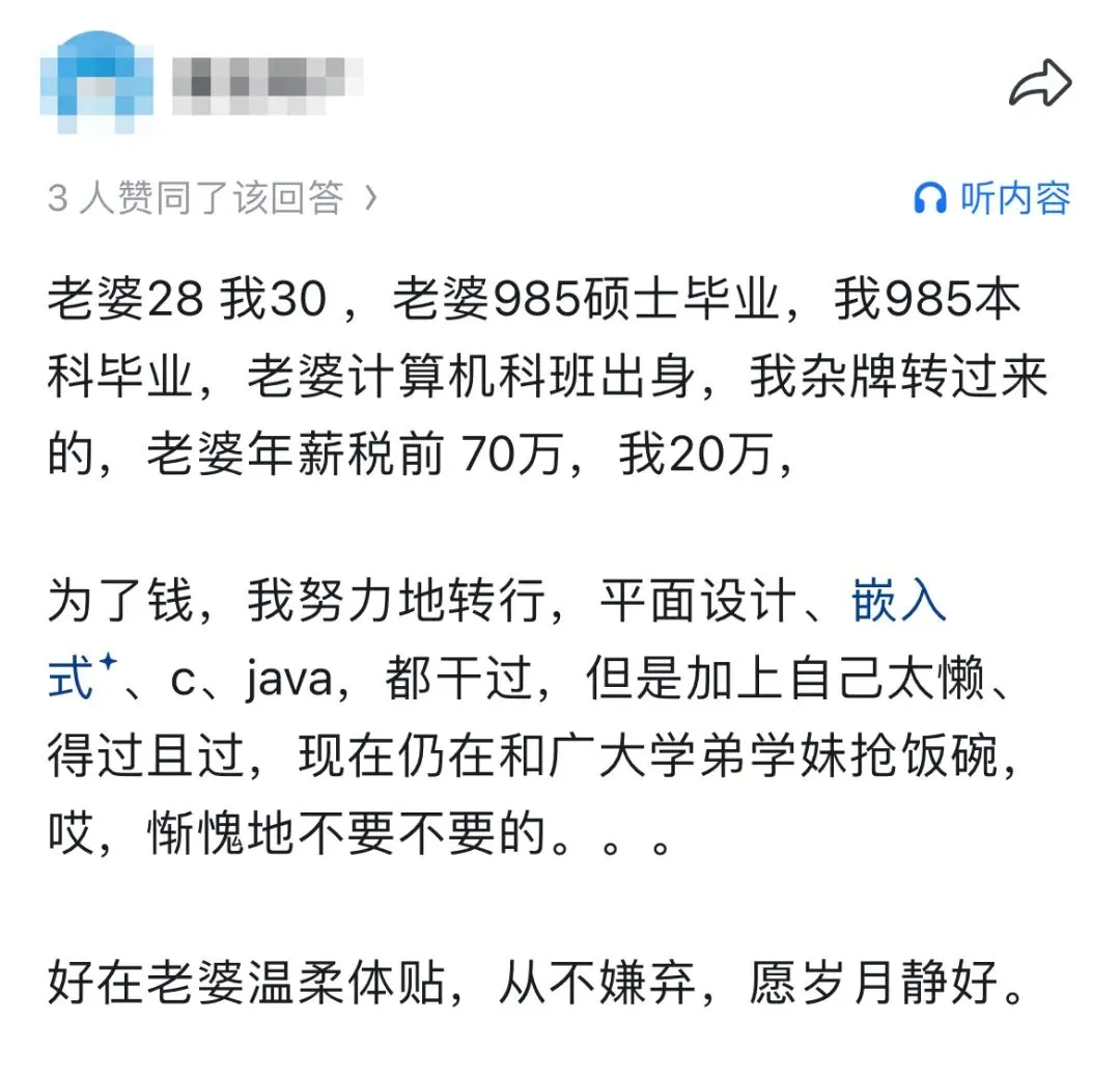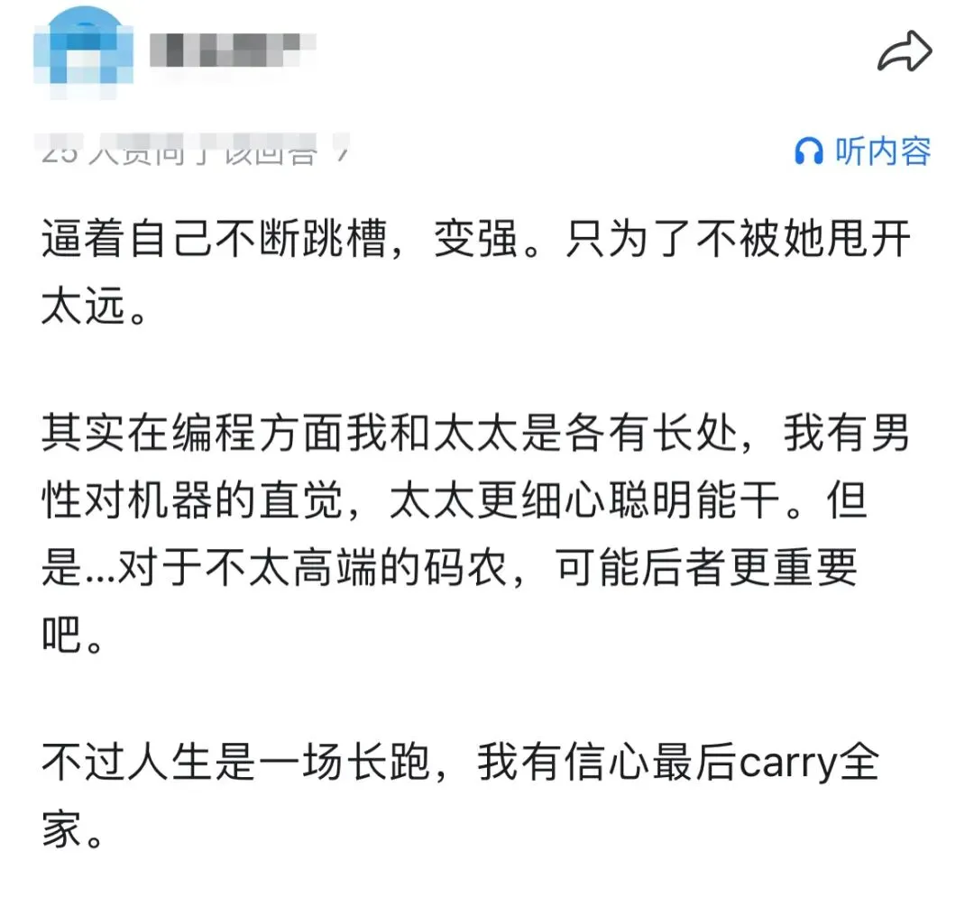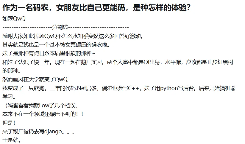 有人因为女朋友凌晨还在帮自己debug感动到痛哭;有人在工作中是前辈实际上偷偷让女朋友帮忙解决代码问题;有人干脆躺平,反正有女朋友撑起这个家庭......