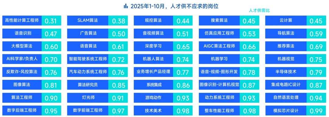 猎聘大数据研究院《2025上半年人才供需洞察报告》显示,今年上半年,AI技术新发职位的整体增长率为36.82%,但即便如此,当前国内AI人才缺口已突破500万,国内供求比例高达1:10,相当于十个岗位争抢一名求职者。