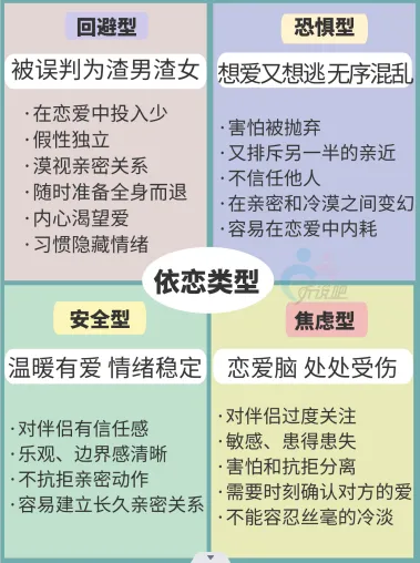 根据一个人的“回避亲密的程度”和“是否焦虑于被抛弃”的强弱,将依恋类型分为4种。