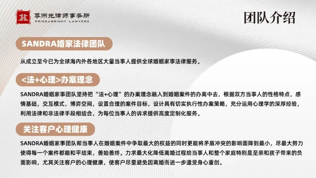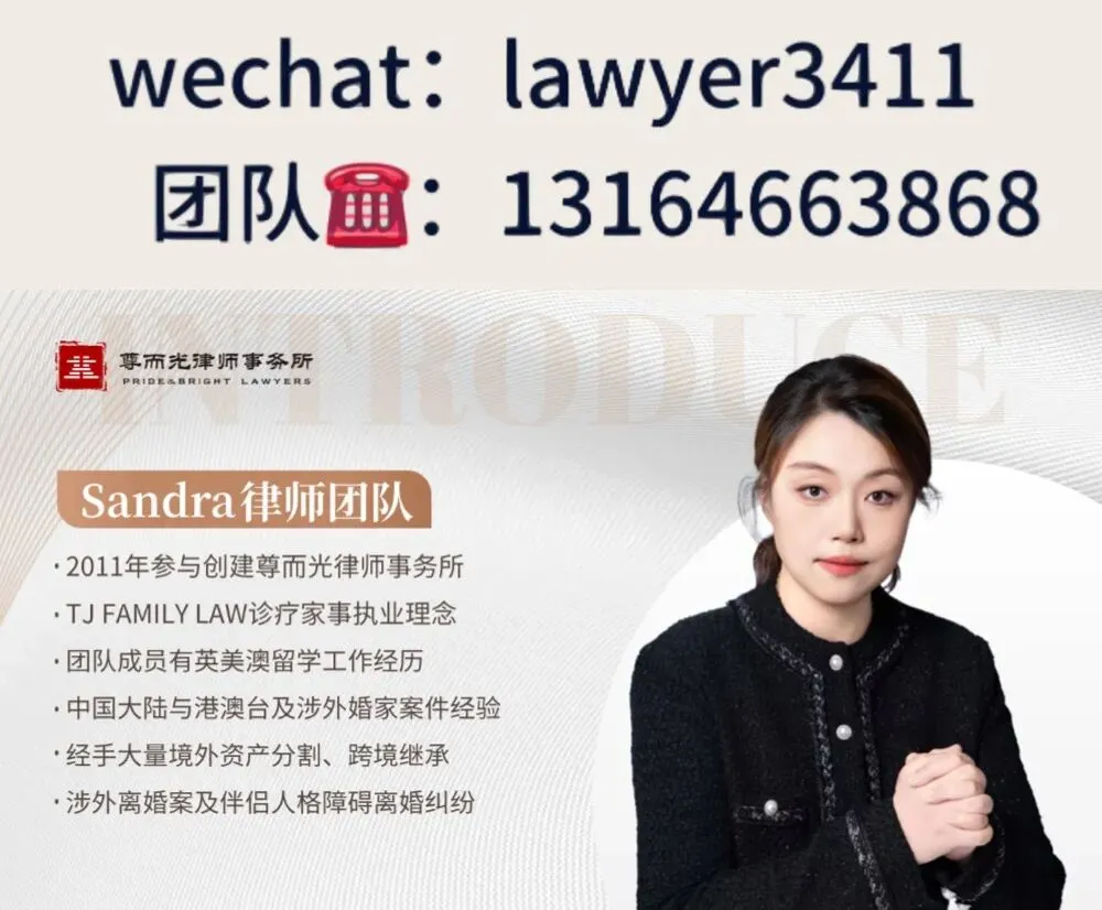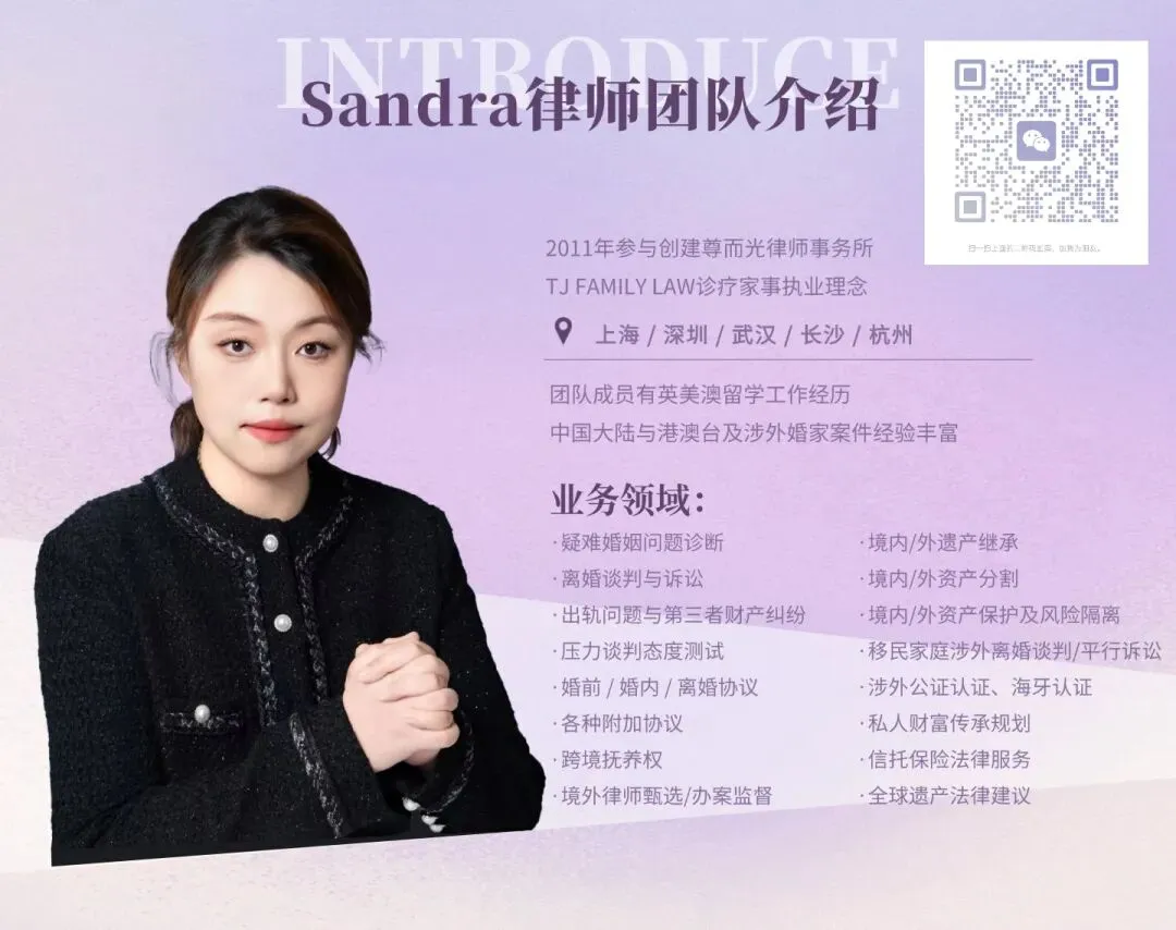 Sandra&王律法律团队:从成立以来一直精耕婚姻家事法律服务领域,服务项目包含中国大陆与港澳台婚姻诉讼和非诉服务、婚姻心理咨询服务、家庭财富传承、分家析产服务服务、涉外婚姻法律服务五大板块