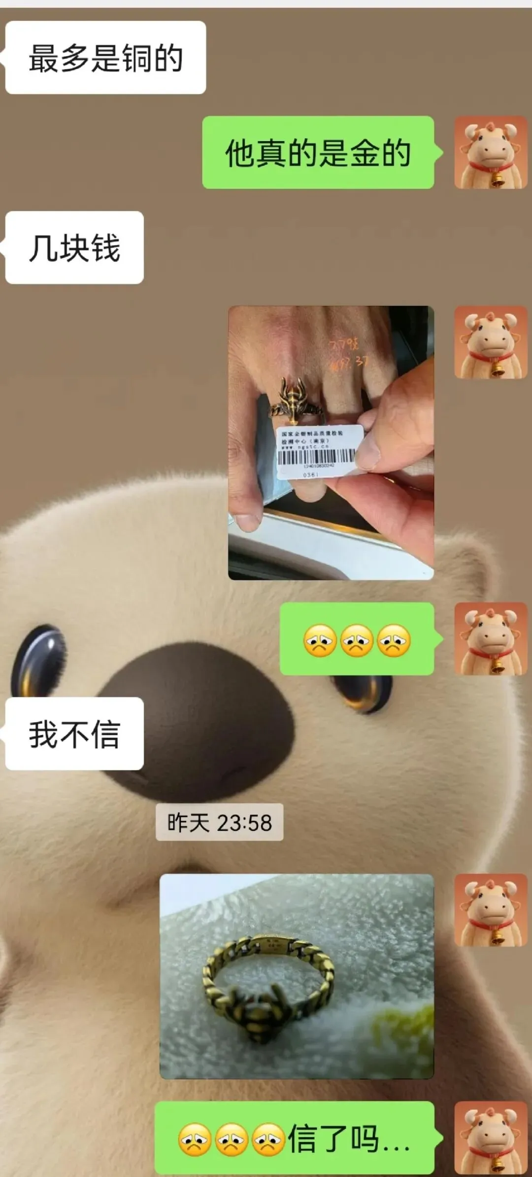 家里人根本不信 说现在这种颜色的最多就是仿金铜合金 几十块钱的东西吧 你别骗我们了 不然你把收据找出来看看 我当时心里其实也有点虚(毕竟这种复古工艺戒指确实容易让人误会)不过摸了摸口袋 还真找到小票了