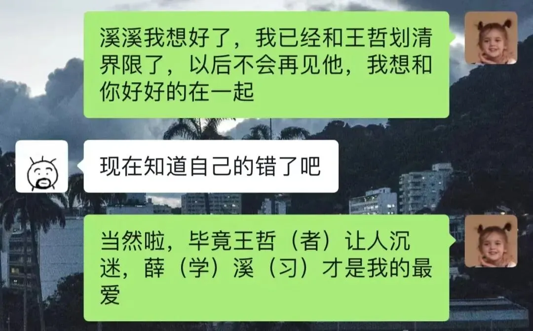 我跟我男朋友薛溪已经在一起两年了。第一次跟他相遇是在期末周的图书馆,那时图书馆总是座无虚席,寝室不是学习的地方,虽然不喜欢几个人挤一张桌子,但也没有办法,只能将就一下。我便径直向那个位置走去。之后就像命运安排一般,无论在图书馆,在快递点,或者在学校的某个角落,我总能遇见他。直到有一天,我们又心照不宣的坐在了一起,他看到我在复习英语,就与我分享了自己总结的作文模板和一些做题的技巧,我突然心动了,就觉得这男生其实挺有魅力的。当我习惯了在图书馆他坐在我附近一起学习,习惯了在快递点的偶遇,习惯了用他的学习方法做题。我突然意识到,我不认识的那个男生早已经渗透在了我的生活,我已经喜欢上了他。我下定决心,为自己设定了一个目标:如果这次我的英语四级顺利通过了,我就正式向他表白!辛勤复习的回报是,那次查分英语四级考了613分!我迫不及待地与他分享 ,并鼓起勇气,向他坦白。幸运的是,他也喜欢我,于是,我们就这样在一起了。之后的时间里,我们经常一起去图书馆,一起看书,一起吃饭,周末偶尔会一起去看电影,去各个夜市吃好吃的……时间一晃而过,我们在一起已经两年了。我以为我们会一直这样幸福下去,但是王哲学弟的突然出现使我陷入深深的苦恼之中。今年暑假的时候,在家里无聊,我便在新生群认识了这位学弟。和他不断接触后,发现他给我的感觉很不一样:他是我见过最有少年气的人,是那种看春风不喜,看夏蝉不烦,看秋风不悲,看冬雪不叹,他像春天里第一片绿叶。开学后在学校里帮助过他几次,给我留下深刻印象的不是他洗不干净衣服的柔顺剂味道,而是他运动时帅气的身影,让人十分上头。最近一段时间,我们仍然保持密切联系。因为我的故事,还经常花钱给他买衣服。虽然有时候他会让我情绪波动很大,但是我还是一次次地原谅他。尽管我知道我和他这样做是不对的,但他对我的吸引力实在太大了,我感觉控制不了自己。一时间,我想起了和男朋友朝夕相处的点点滴滴,想起了我每次问他不会的题,他都认真教我的样子,想起了三年里我们也是经历过各种矛盾又和好如初......我后悔了,觉得对不起男朋友。我考虑了一个晚上,决定与学弟彻底划清界限。毕竟,只有与正确的人在一起,才能继续取得进步。虽然那个男生给我带来了新鲜感,但也让我迷失了方向。这件事情之后,男朋友一如既往地原谅了我,我们又双叒叕在一起啦!相信也有同学像我一样被王哲(者)吸引,晚上不睡觉组团开黑,白天不听课组团补觉。