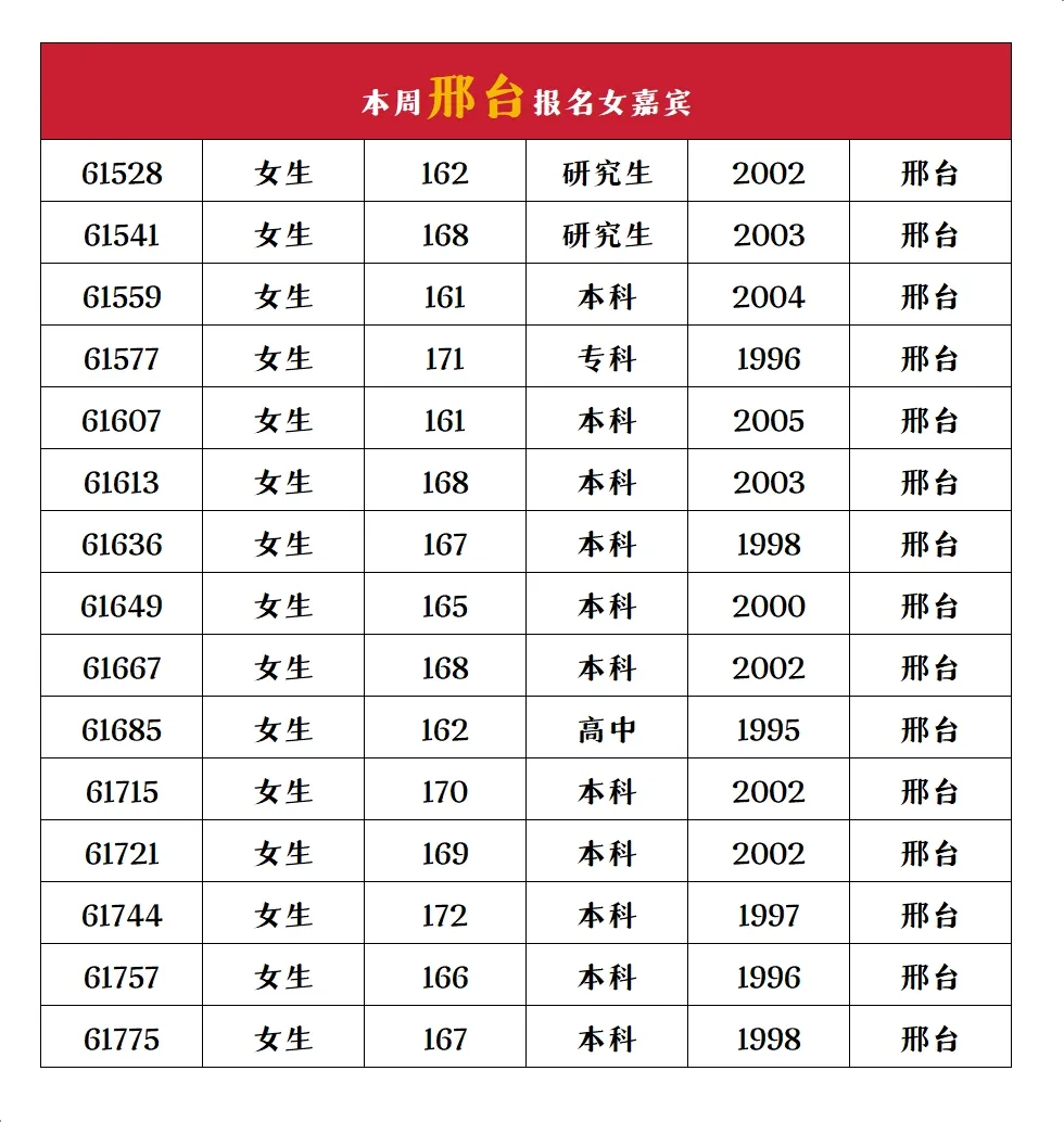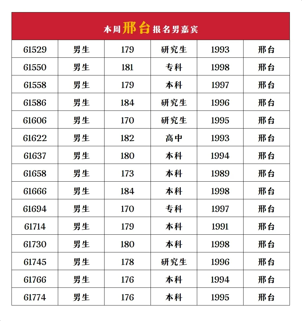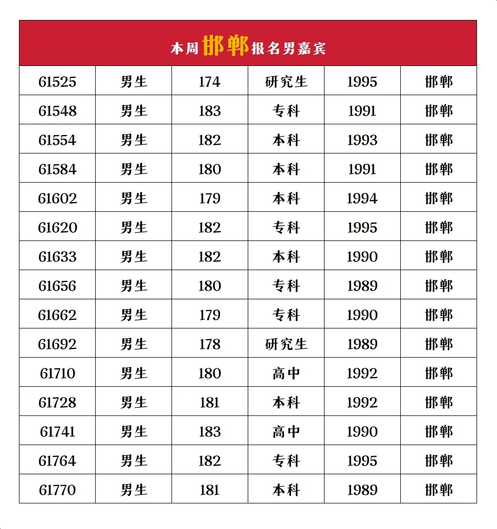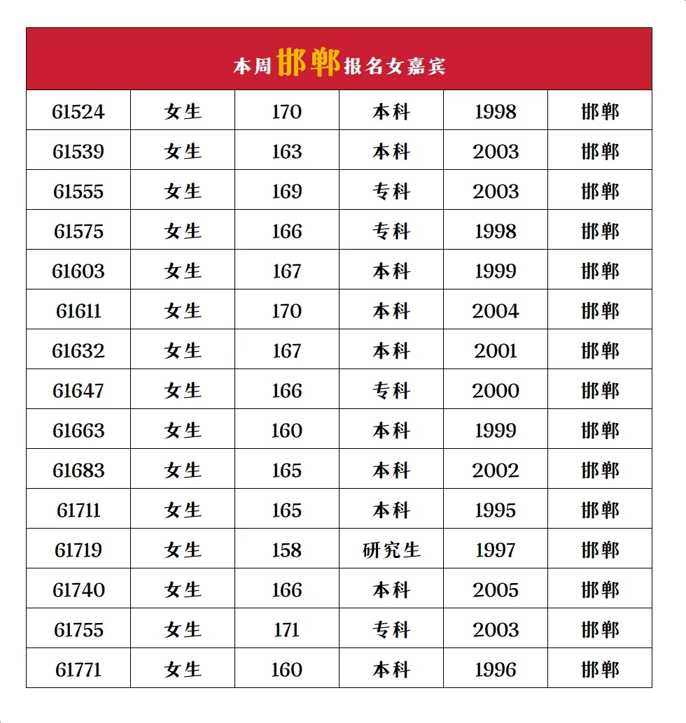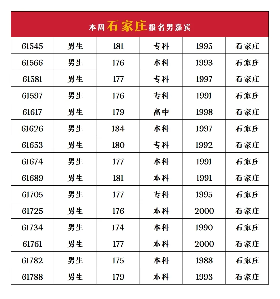 本期恋爱匹配已报名嘉宾,篇幅有限,每个城市仅展示部分嘉宾,目前河北开放城市:石家庄、保定、唐山、邯郸、沧州、邢台、廊坊、衡水、张家口。