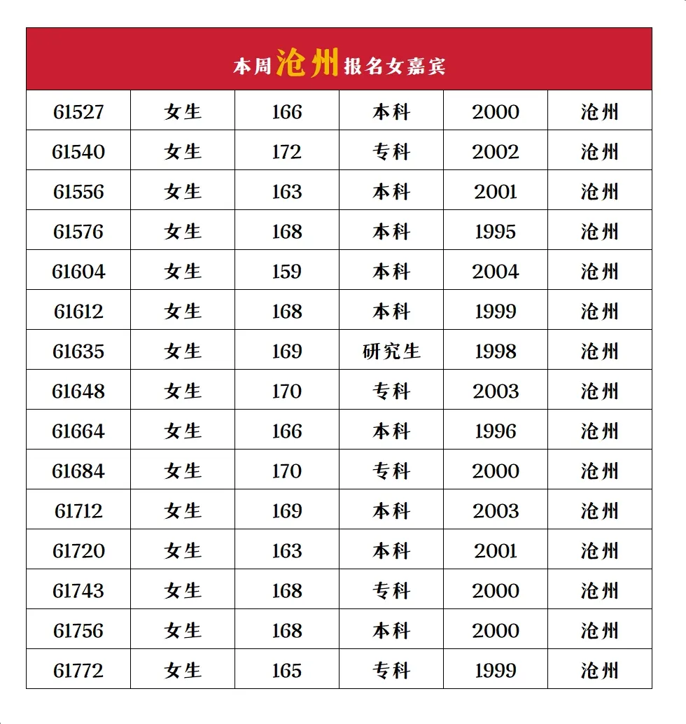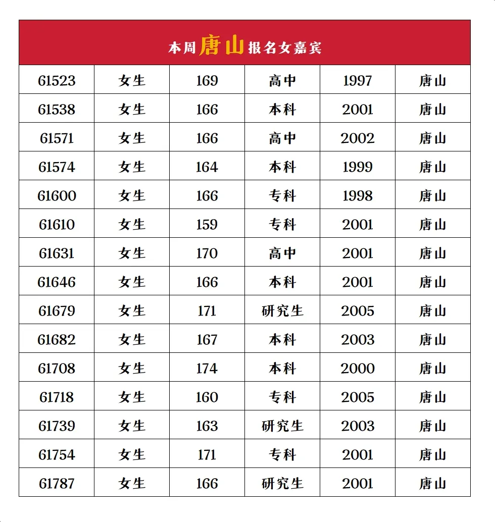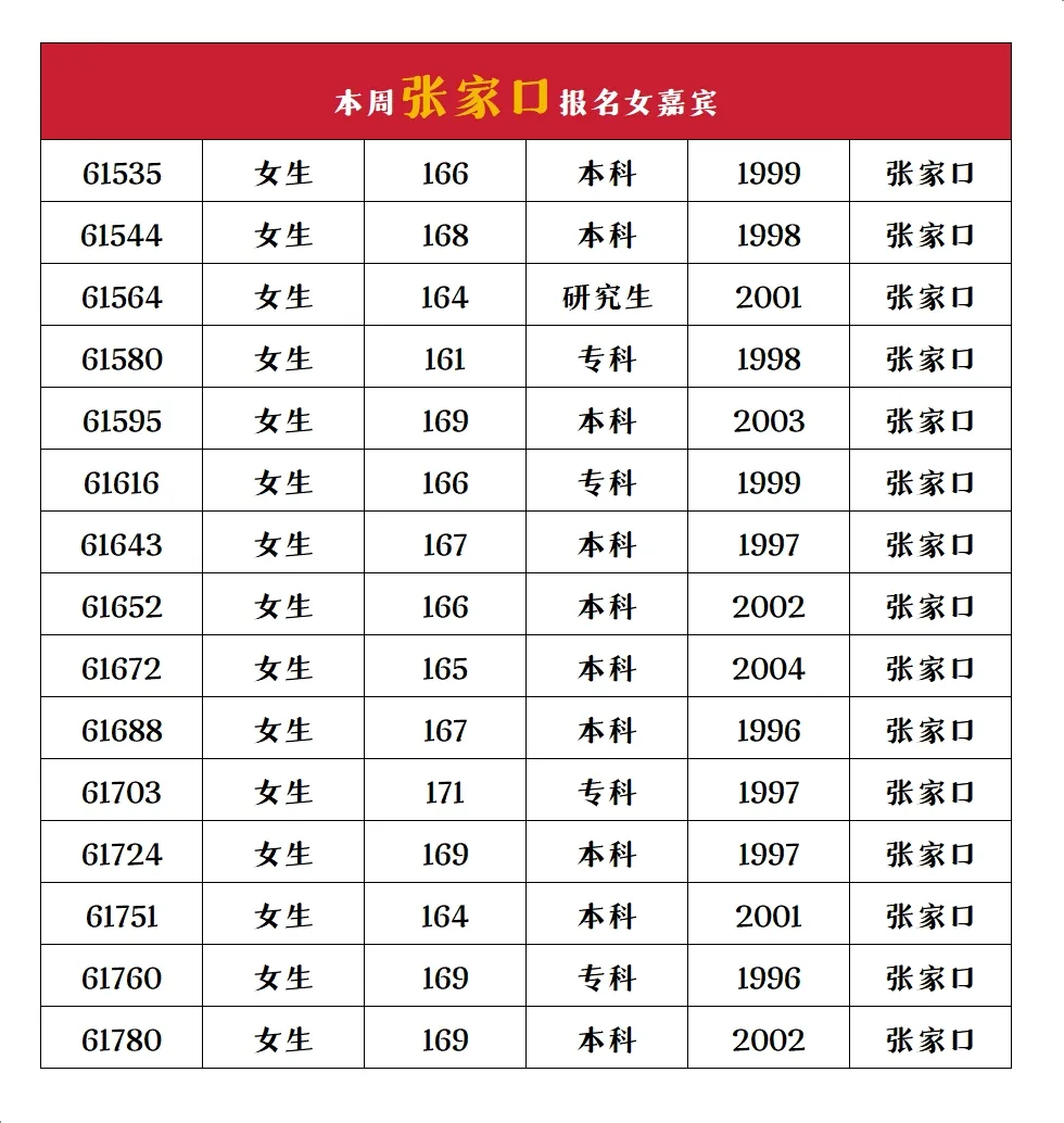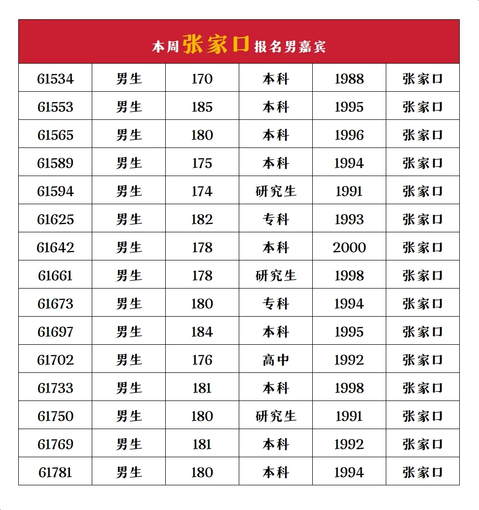 本期恋爱匹配已报名嘉宾,篇幅有限,每个城市仅展示部分嘉宾,目前河北开放城市:石家庄、保定、唐山、邯郸、沧州、邢台、廊坊、衡水、张家口。