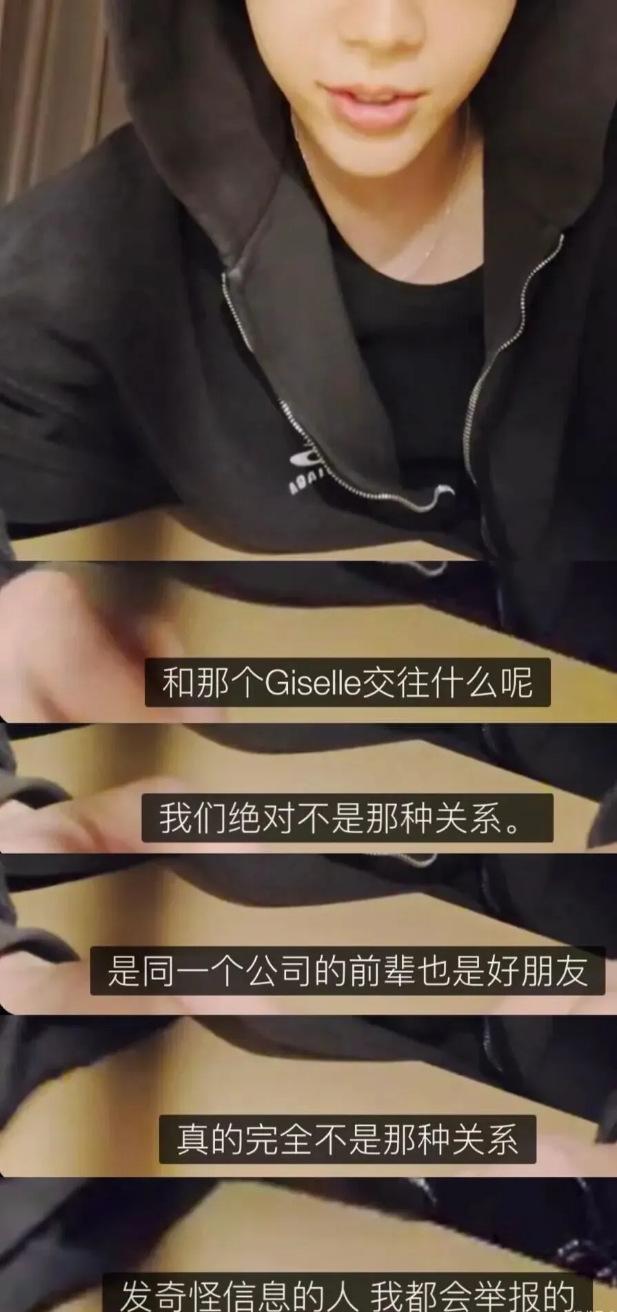 “刚刚老是有一些奇怪的评论出来, 是不是在和GISELLE交往这种话。我们完全不是这样的关系, 是同一个公司的前辈, 也是好朋友。真的完全不是那样的关系, 请不要误会。”