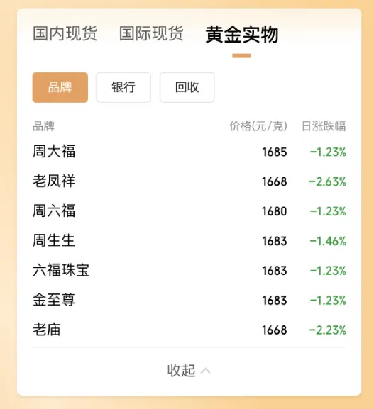 受国际金价影响,国内品牌金饰价格也有所回落。1月30日,国内黄金饰品价格对比显示,周生生报价1683元/克,周大福报价1685元/克,老凤祥报价1668元/克,老庙黄金报价1690元/克。