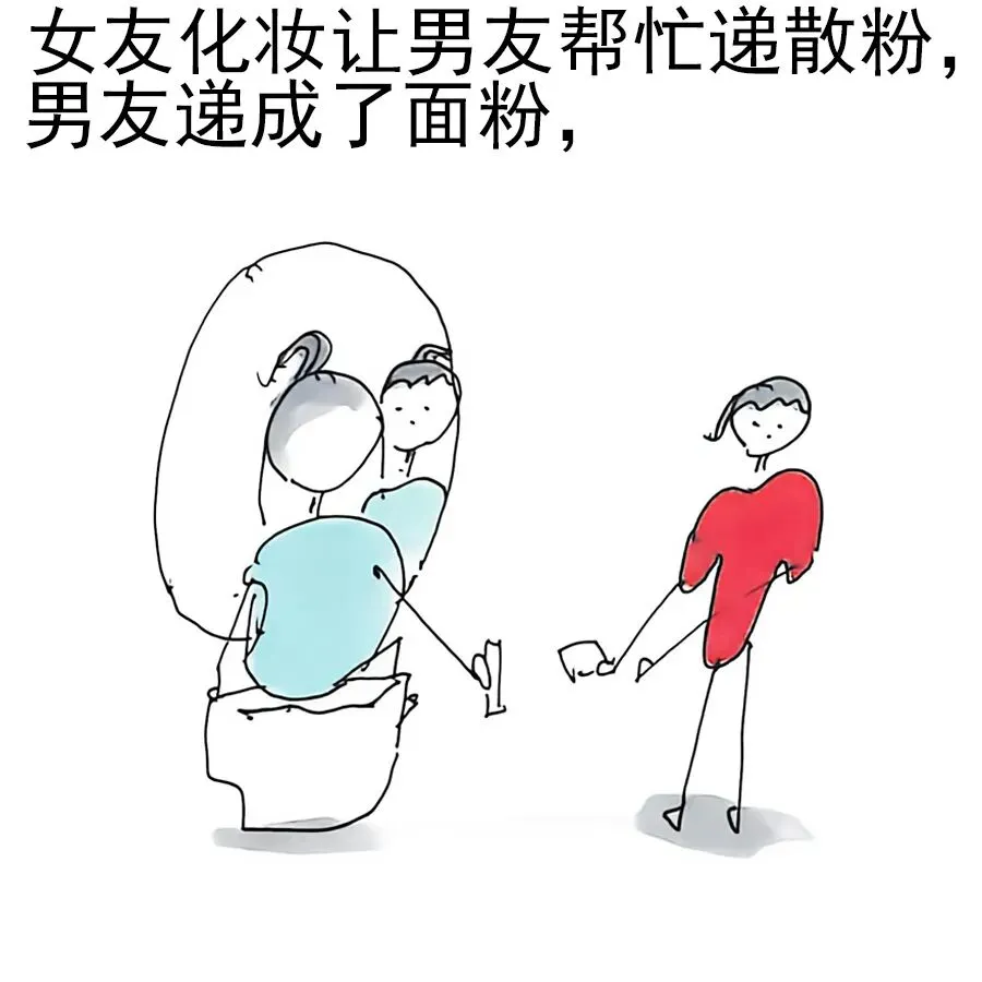 开心漫画.女友化妆让男友帮忙递散粉,男友递成了面粉,她抹脸上瞬间白一块,瞪着男友半天,憋出一句:这下不用修容了,脸比脖子白八度.