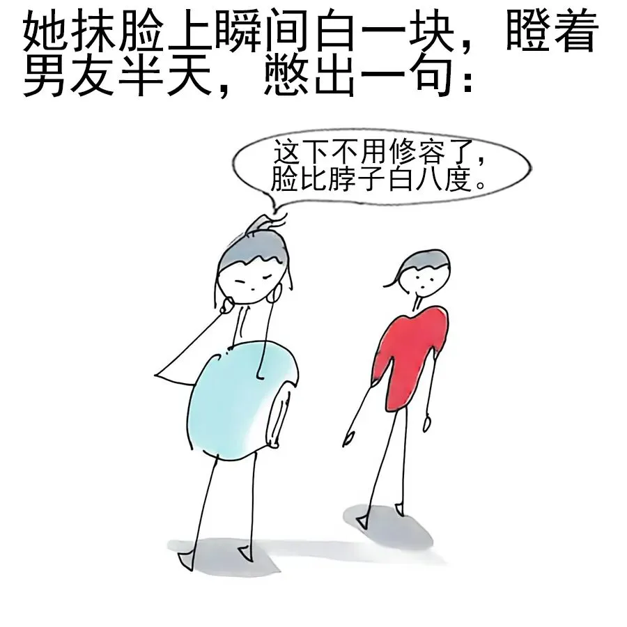 🌺🌺女友抹脸上瞬间白一块,瞪着男友半天,憋出一句:“行,这下不用修容了,脸比脖子白八度。”