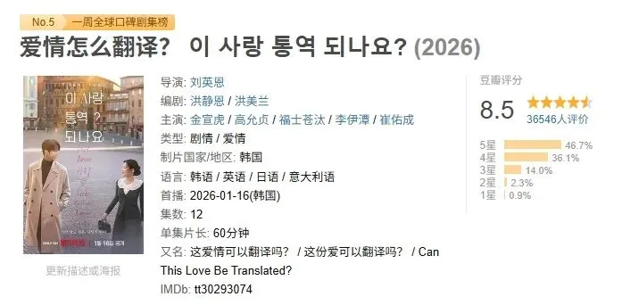 「爱情怎么翻译?」Netflix全集上线后,迅速横扫韩、日、新加坡等多国热度榜。豆瓣评分从开分7.8一路逆袭至8.5,超3万人打分,妥妥地现象级韩剧!