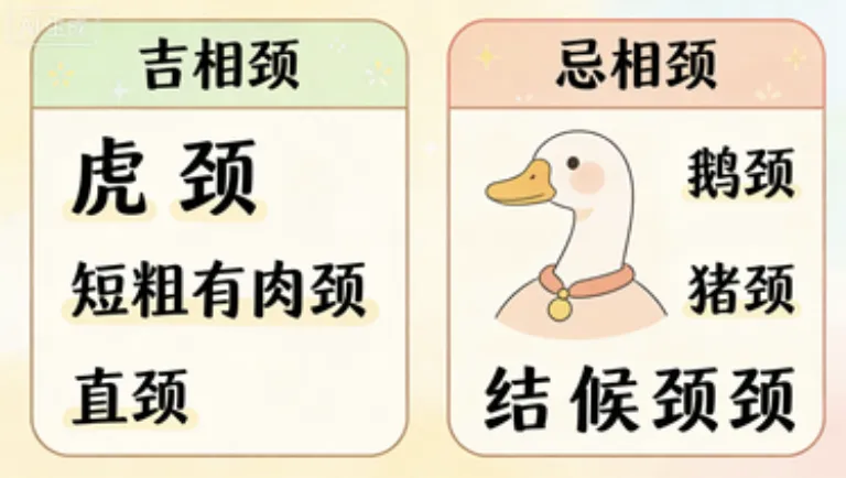 :脖子上有结喉骨、锁喉须的男生,一生多灾多难,运势坎坷,胖男生如果有结喉骨,更是大忌;脖子歪歪扭扭、弯曲的,性情脆弱,遇事容易退缩,婚恋里遇到问题只会逃避,不会解决;颈向后倒的,性格懦弱没主见,大事小事拿不定主意,难成大事;脖子没力气、连头都撑不起来的,精气神差,一生贫穷还易早夭,给不了家庭稳定;颈皮薄细、还有斑痕不洁净的,性情鄙俗呆滞,三观和眼界都有限,相处久了容易有矛盾,还难有上进心。