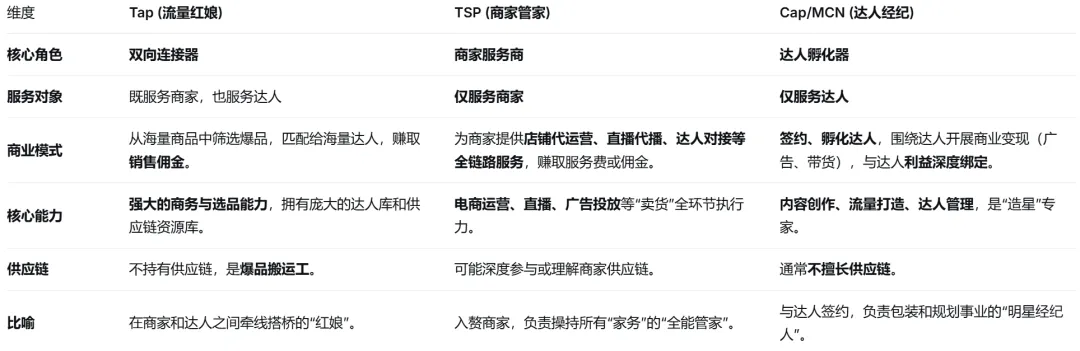 最理想的状态:你自己团队的运营能力(TSP功能)是基础,然后用Tap来放大爆品流量,与Cap/MCN合作特定项目。这样你才能把主动权握在自己手里。