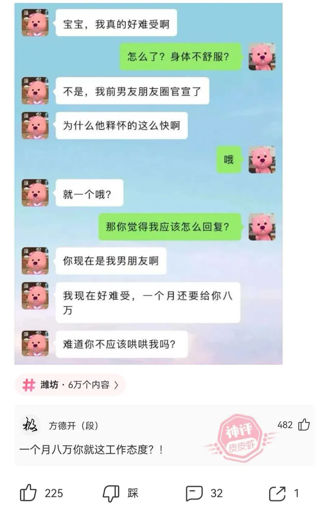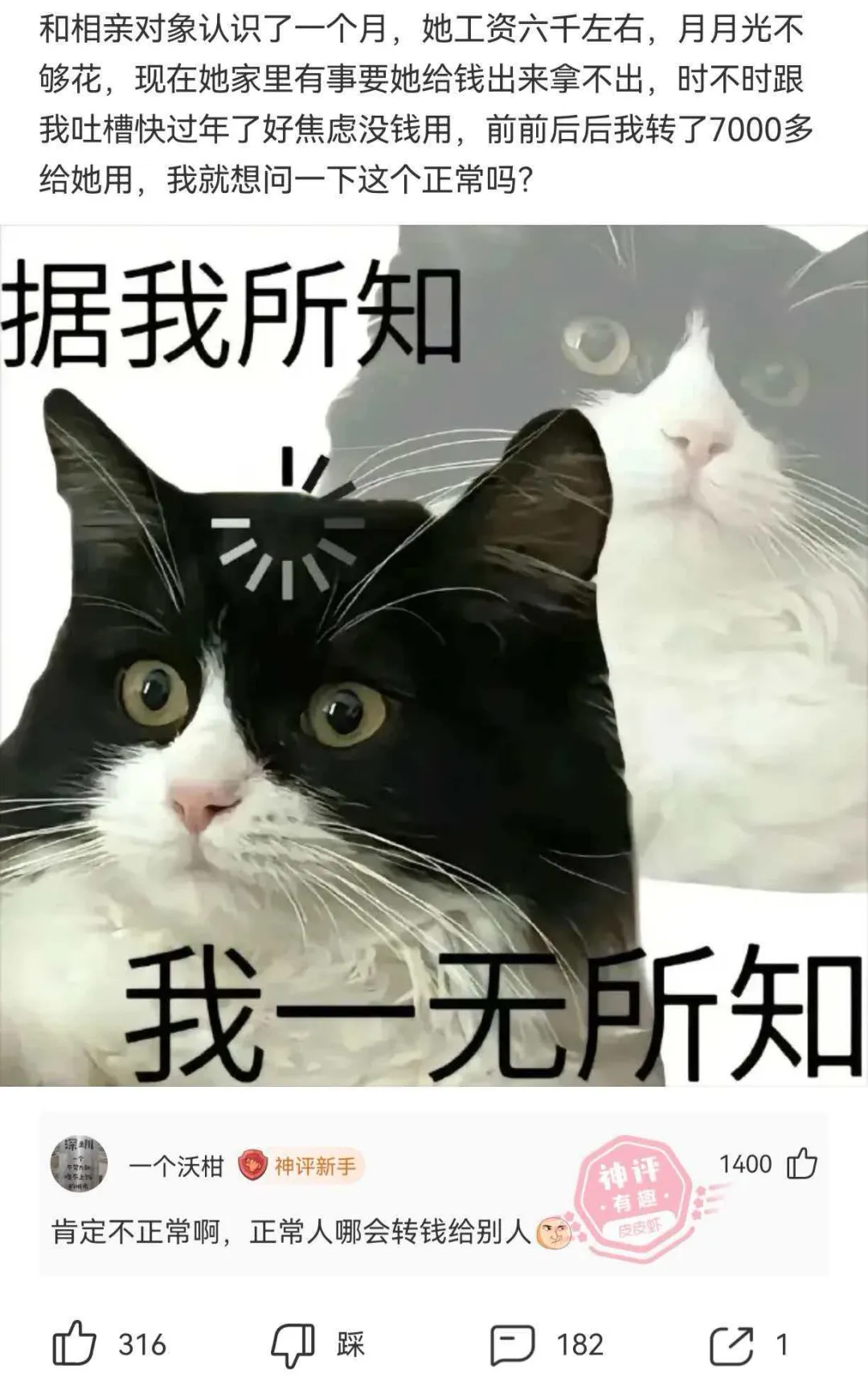 搞笑神回复01:和相亲对象认识了一个月,她工资六千左右,月月光不够花,现在她家里有事要她给钱出来拿不出,时不时跟我吐槽快过年了好焦虑没钱用,前前后后我转了7000多给她用,我就想问一下这个正常吗?