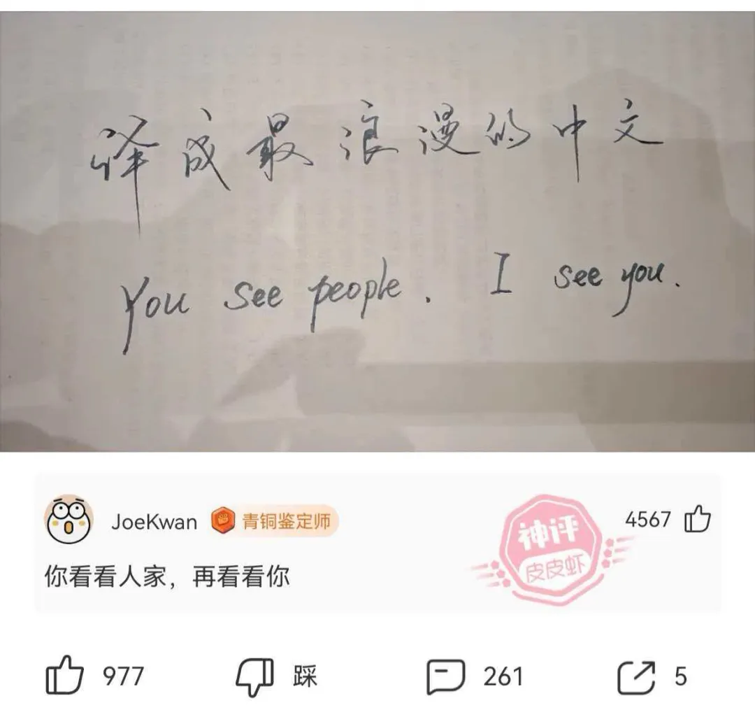 搞笑神回复03:译成最浪漫的中文!You see people, I see you.