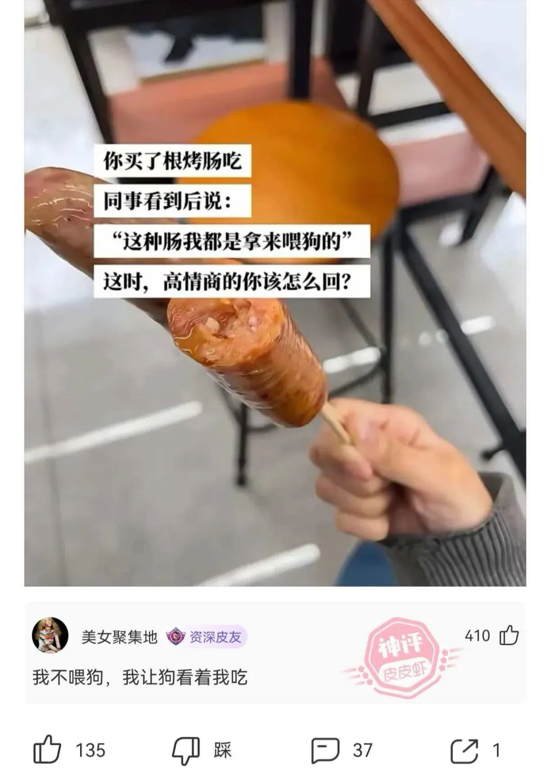 搞笑神回复04:你买了根烤肠吃,同事看到后说:"这种肠我都是拿来喂狗的"这时,高情商的你该怎么回?