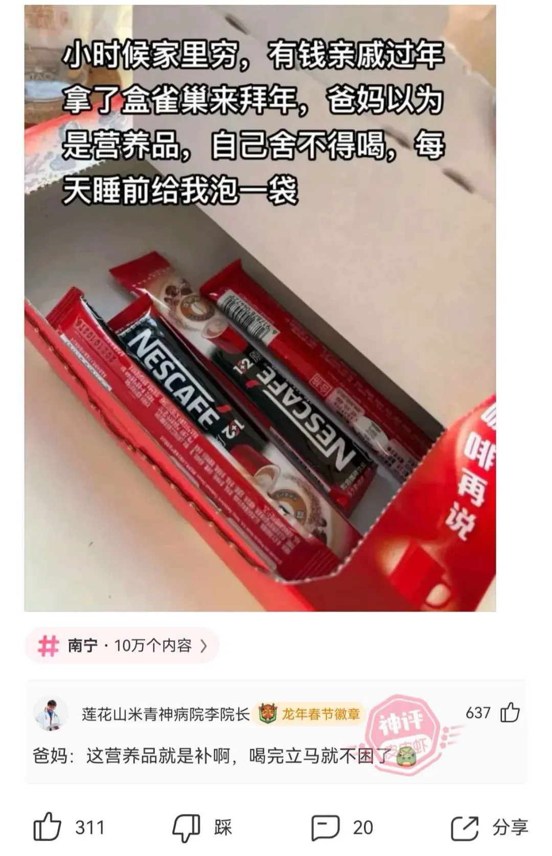 搞笑神回复06:小时候家里穷,有钱亲戚过年拿了盒雀巢来拜年,爸妈以为是营养品,自己舍不得喝,每天睡前给我泡一袋!