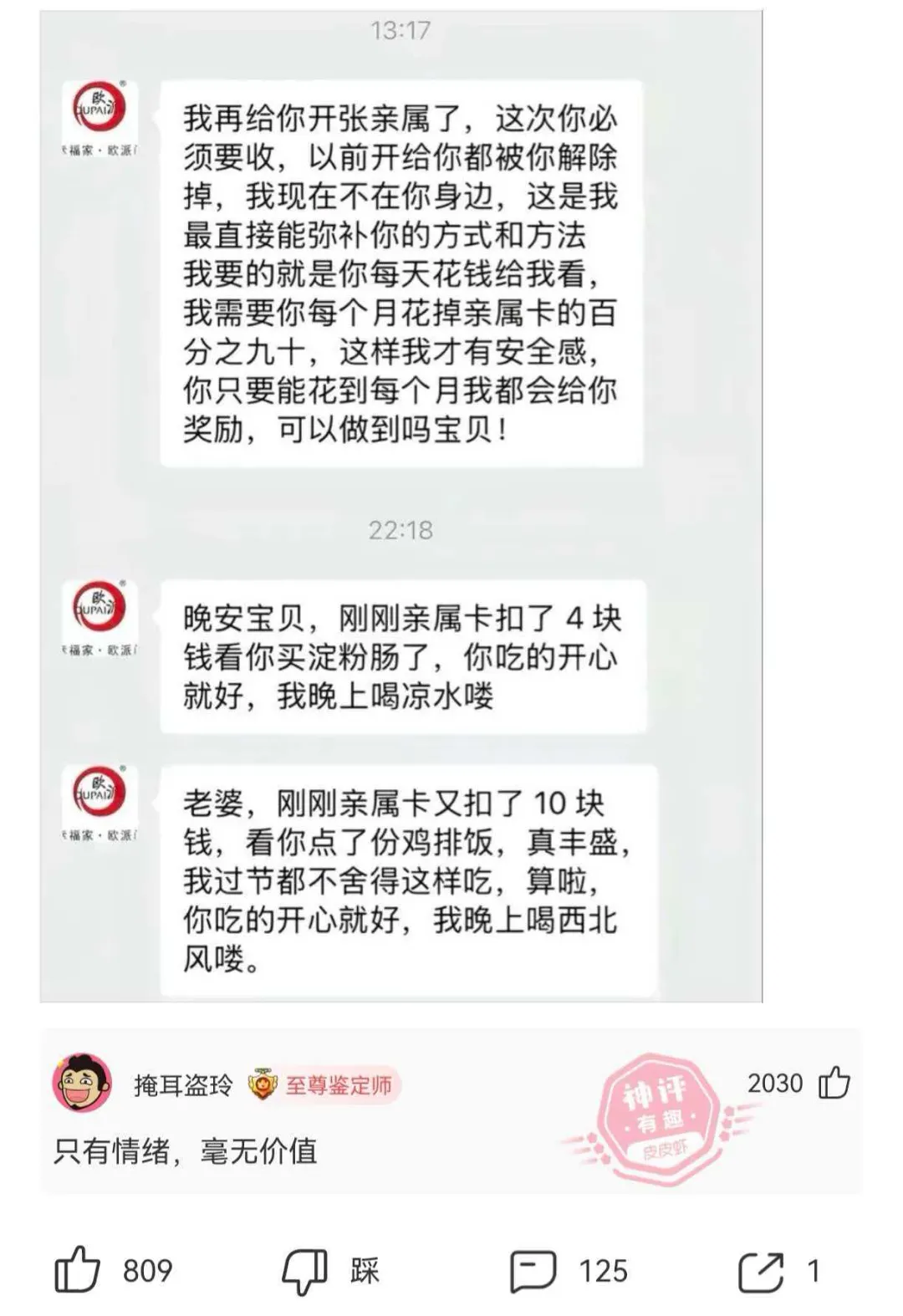搞笑神回复07:老婆,刚刚亲属卡又扣了10块钱,看你点了份鸡排饭,真丰盛,我过节都不舍得这样吃,算啦,你吃的开心就好,我晚上喝西北风喽。