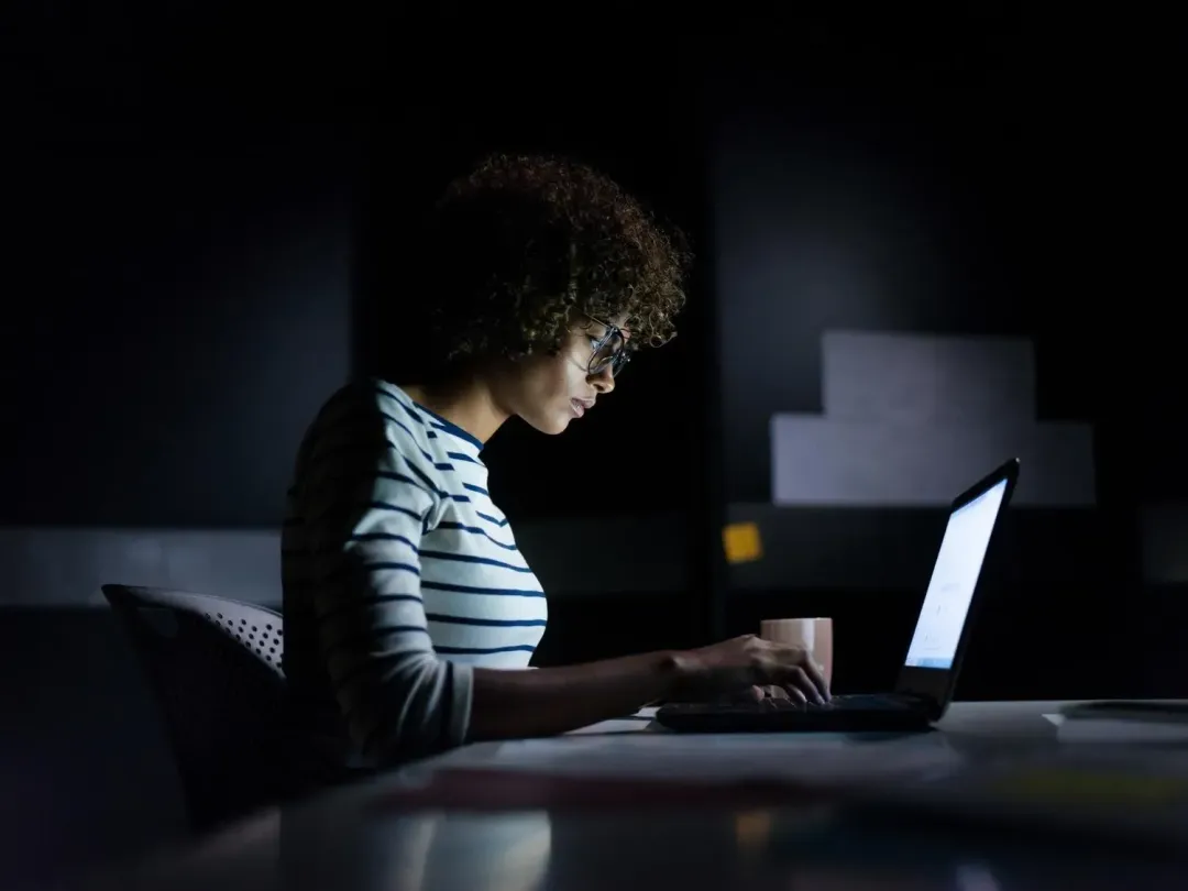 一名职场女性深夜仍留在办公室,坐在笔记本电脑前专心工作,手指不停敲击键盘。图片来源:GETTY