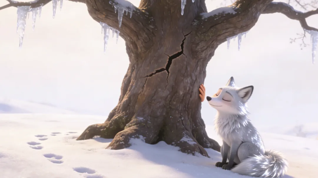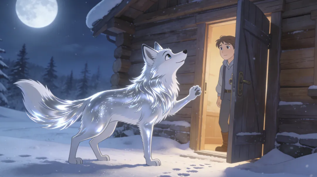 这时,门外传来轻柔的抓挠声。诺亚开门一看,雪地里站着一只银狐,毛色在月光下如同流动的水银,眼睛是两颗暖琥珀。