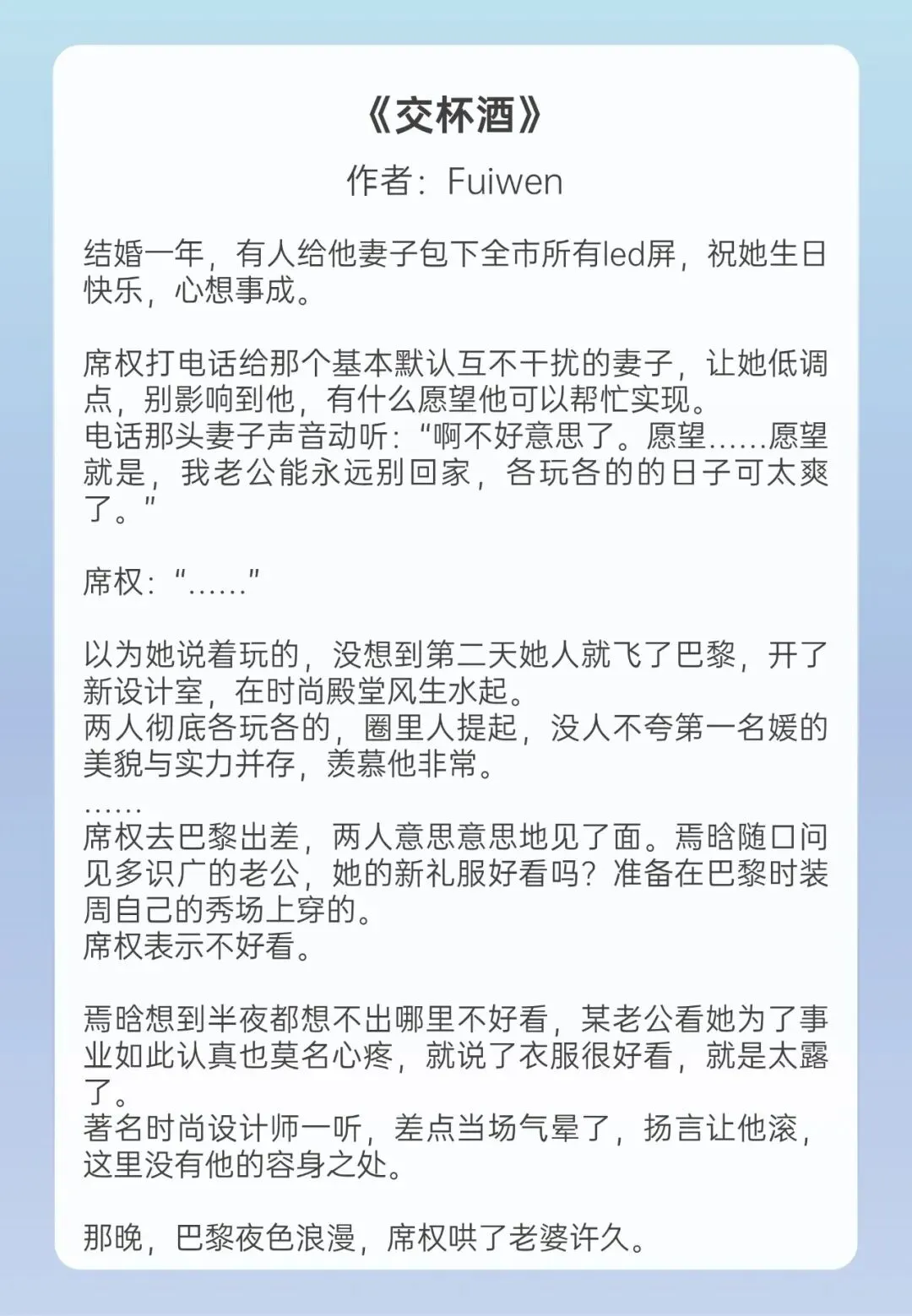 约夫妻》作者:烟波碎黑心商人X无产青椒,破镜重圆追妻火葬场,男女主都不完美,人设都很不讨喜,两人属于互相折磨逻辑自洽。这本真的很有作者个人特色。
