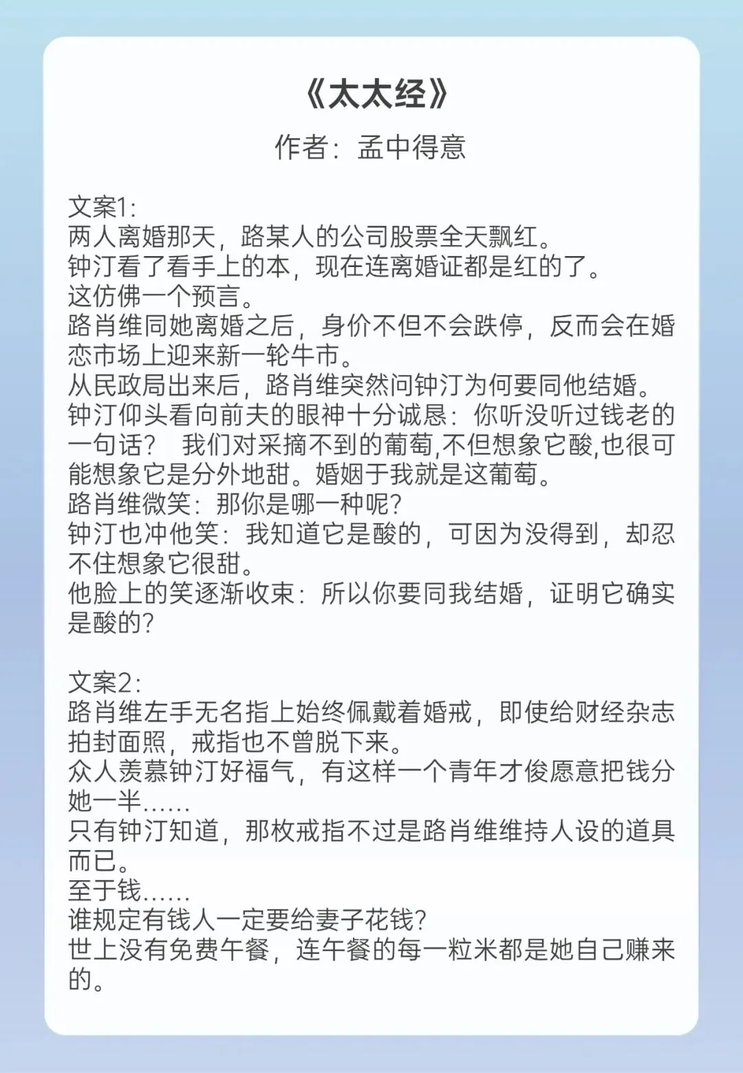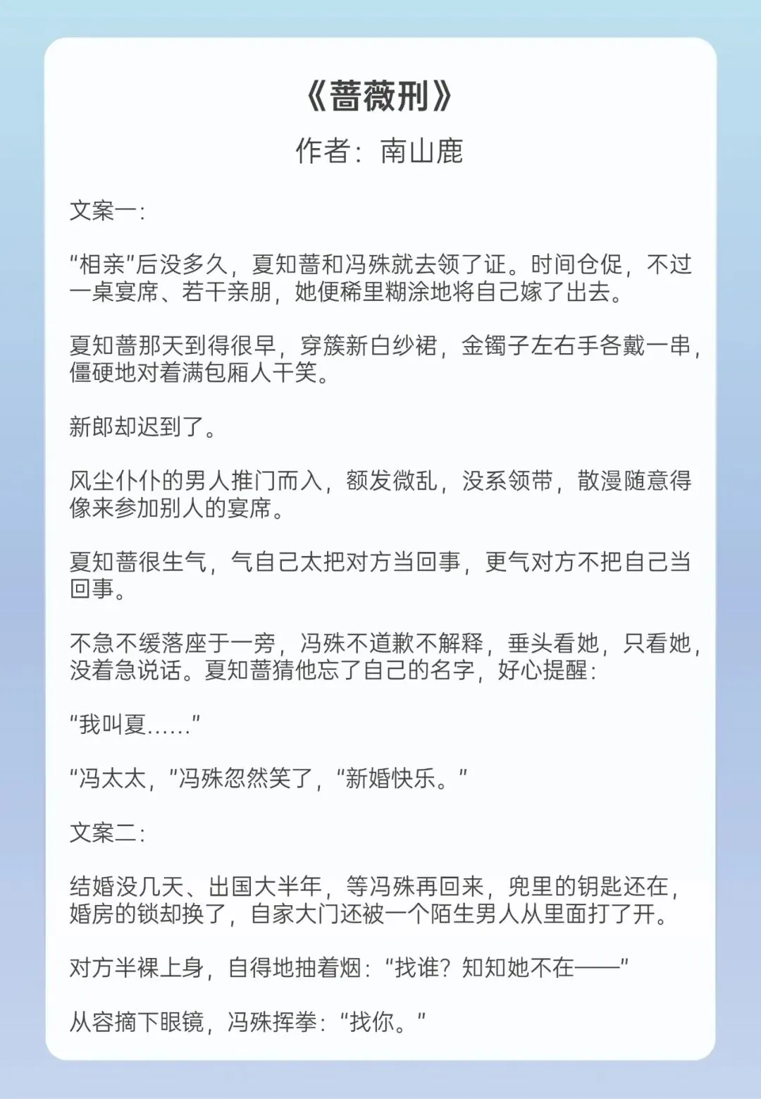 这本前期男女主因为各种原因差点到要离婚的地步,后女主开窍不再遮掩自己,开始依赖男主,将自己的爱意展现,男主以前就喜欢女主却因家庭原因怕与女主不得善终不敢表现出来,男主与女主早就认识了不过女主不知道。这本的男二相当烦人,对女主挟恩图报,时不时在男女主面前刷存在感。