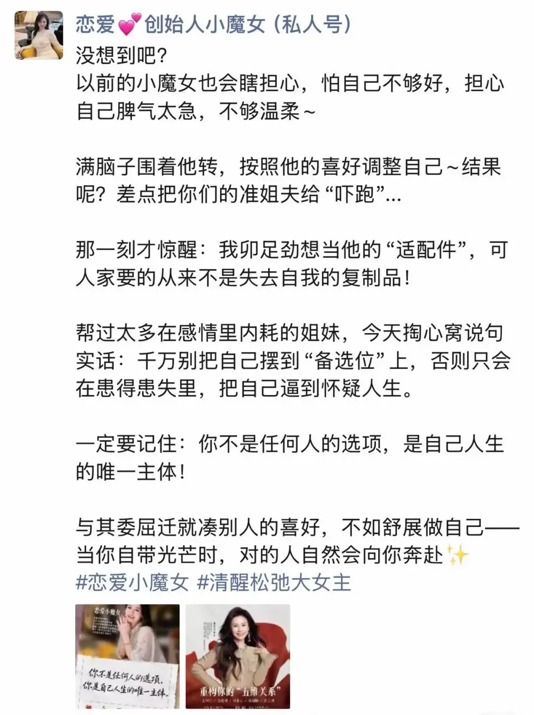这里会给男人一种感觉就像支付宝一样:“我给你了,你就默认收着”,双向沟通变成一个人的show!好多姐妹们表现出来很需要对方的夸赞和情绪价值,或者只关注自己的感受,只说自己想说的,只说和自己有关的事情等等。我的一个学员Linda就遇到过这样的困惑,觉得自己很努力去带节奏带气氛,为什么男生总是不接茬。我一看她的聊天记录,全篇都是自己的个人展示,今天发自己的工作记录,明天发自己的耀人成绩,后天发自己做的烘焙作品等等。其实偶尔展示自己,可以增加关系的趣味性和吸引力,可像这样拼命展示价值的单向沟通,并没有让对方感到参与感。要知道,我们找的是一个男人,不是一个去夸赞你的观众,对吧!