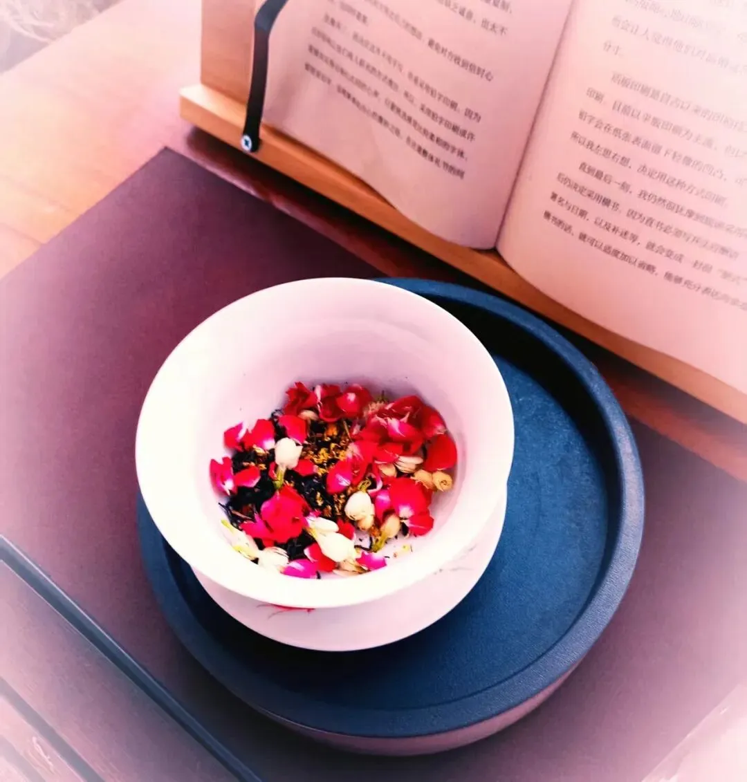 可又觉得单喝茉莉花茶未免太淡,少了点醇厚的底味,转念就想到了金骏眉,那股蜜润的香味,好些天没尝,还真挺惦念。也不知道怎么回事,今天格外贪恋花香,玫瑰花的馥郁、桂花的甜润总在脑子里绕,实在难抵这份诱惑,索性不纠结,把金骏眉、茉莉花、玫瑰、桂花这四样,一股脑都拿到茶台前,准备泡在一块试试。