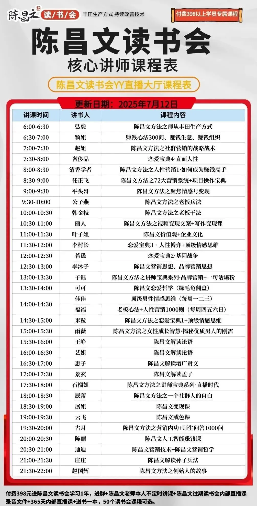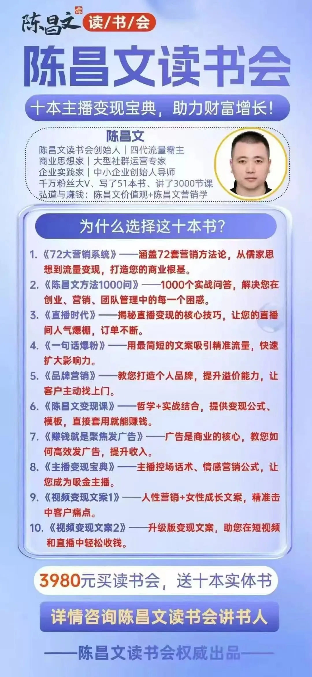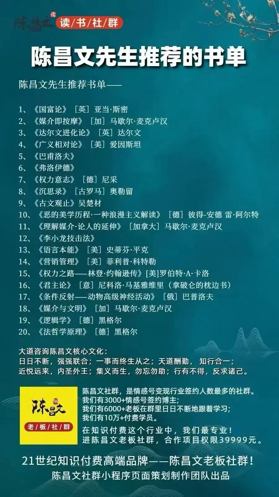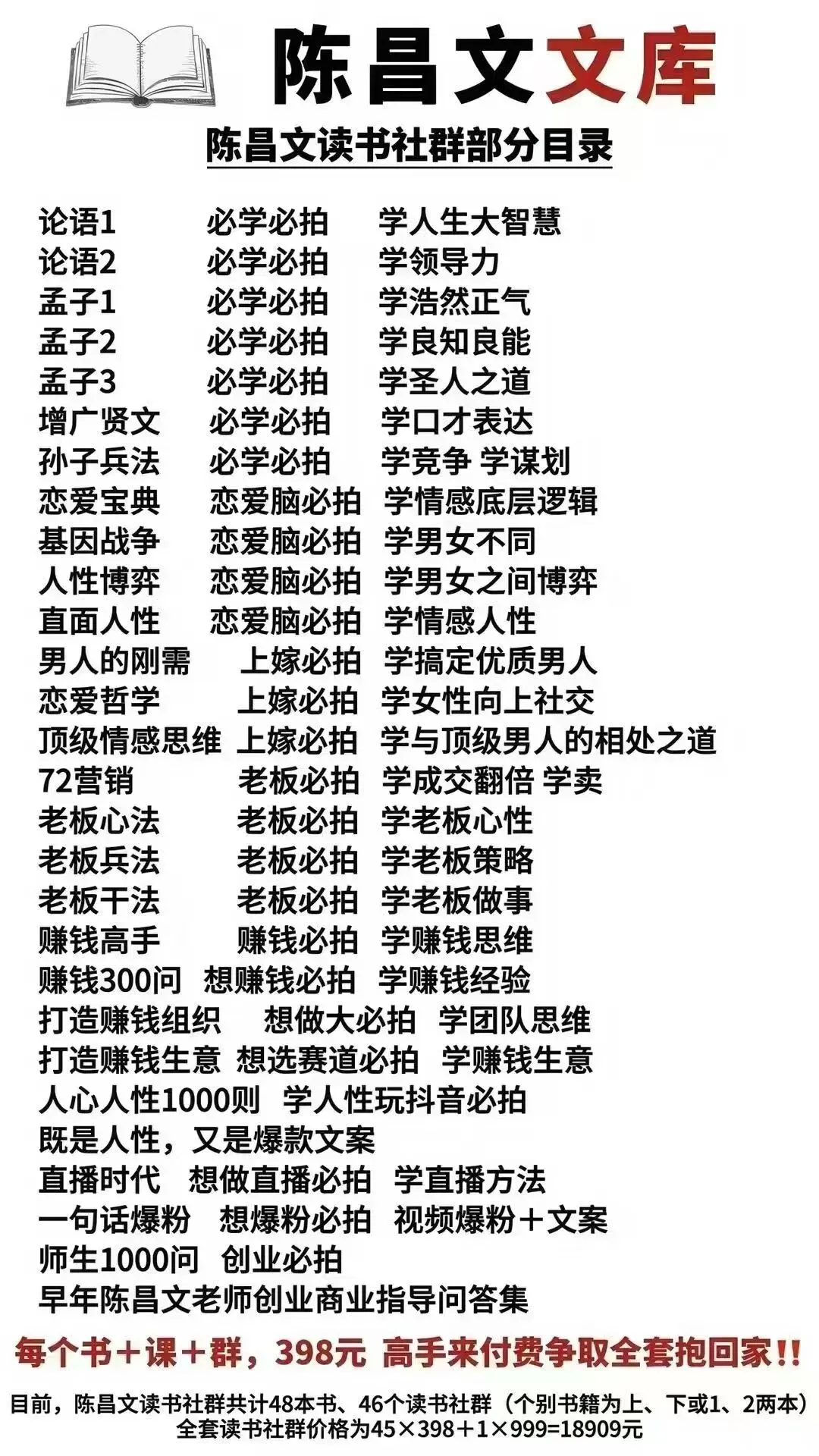 男女之间的恋爱竞争,婚配竞争是非常激烈的,您只想等待缘分是不可能的,基本不可能,您得找,得寻觅,还得主动出击,很多人脑子有问题,想坐等天上掉馅饼。无论男女,这都不可能,一分简单的工作,一个简单的客户都是抢来的,在这些人的脑子里,居然好的配偶是等来的,居然这些是可以靠缘分的,这些的人弱智思维注定导致自己的恋爱,婚姻不幸福,婚配,恋爱竞争,配偶争夺,是比创业,赚钱更激烈的资源争夺比赛,在这项比赛中,很多人都败下阵来,更有很多傻瓜呢,他们就是等待,靠天分配,哈哈哈。——陈昌文我们想要找到优秀的对象,我们必须自己非常优秀,我们要有钱,能力强,人品好,还有识人辩人的能力,要知道什么是该付出的,什么是不该付出的。遇人不淑,要赶快跑,否则,被骗钱,骗色划不来。要理解社会上有很多坏人,并非到处都是好人。好人少。要理解这个思维,否则,被坑是大概率事件。——陈昌文我们必须专心致志的学习男女关系,恋爱关系,学习家庭关系,处理好夫妻关系,把这个理顺了。当然,最重要的一环,是您选择恋人的时候就要选对。选错了,痛苦一生。——陈昌文 男女关系,恋爱关系,家庭关系,是每一个正常人要面对的问题,很复杂,所以需要学习,处理不好这个关系的人,很难有社会成就。——陈昌文 对于一个群体,我们必须要要礼乐教化。对于粉丝,直播,视频,我们必须天天强调尊师重道,礼乐教化,这样,就会把垃圾人过滤掉。这样,我们的生意就更好做。垃圾人理解不了什么叫着礼仪,什么叫着尊师重道,您天天谈论这个,他受不了,就走了。我们就不要赚他们钱了。我们也不用接触他们服务他们。这样,我们更轻松,生意更好做。大家也舒服。——陈昌文有感情的人,才能听懂音乐,才能喜欢音乐。但感情厚的人,也容易让自己倒霉。真正的高明多人,是躲起来听听音乐,陶冶情操,混社会的时候,又要避免自己感情用事,一厢情愿了。一般情况下,都是一厢情愿,您想帮别人,别人惦记的是您的肉,您的身家性命,肉身菩萨,您打算割肉喂鹰了吗?——陈昌文尊师重道,孝敬父母,必须是发自内心的,彻底的尊重,彻底的敬重,而不是一会一个想法,一会一个借口,一会一个说法,这都是不正之人,没什么大用的人。唯独有真正发自内心的尊师重道,孝敬父母的人,才能懂得礼仪文化的博大精深。我们建立的社群,就是要收到这样的人,请所有人明确宣传,我们建立的社群,只收这样的人。——陈昌文做社群,要彻底尊重真理,真心实意为社群里的人服务,而且要发挥群众的力量。社群围绕自己的产品,营销,形象去工作,大家有饭吃就行。不用跟任何人合作,知识社群,尤其牛逼,需要领头人足够的智慧,坚持原则,爱护群友。这个社群才能真正成长的非常牛逼。坚决不做色厉内荏的人,坚决不跟任何人合作,坚决不上当,坚决不自我矮化,我们社群本来就很牛逼,不需要任何人来指手画脚。——陈昌文不尊重真理,就会别人糊弄,不讲真理,听信一些骗子,别有用心的人,您相信他,他就糊弄您。这本质是内心软弱导致的。我们做人应该刚强,只讲真理。特别是在我们有社群的情况下,我们是一个集体,一起对付这些骗子,坏人。——陈昌文 社群是一个集体,这个集体在实践中,一定找到真理,比如,玩短视频的真理,搞书籍营销系统的真理,搞直播的真理,营销的真理,卖货的真理。当社群找到真理的时候,我们就尊重这群群体找到的真理。在这个模式下,我们就一直弄就行了。做人,不要自我矮化人格,色厉内荏的人,容易自我矮化自己,表面是上有原则,实际上,我们容易动摇,软弱会给自己以及团队造成损失。——陈昌文
