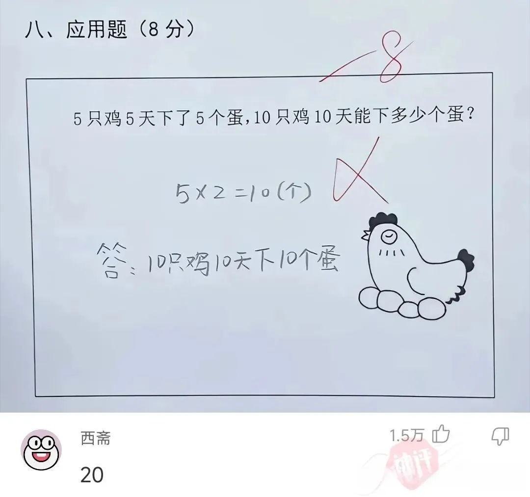 居然错了,5只鸡5天下了5个蛋,10只鸡10天到底下了几个蛋?