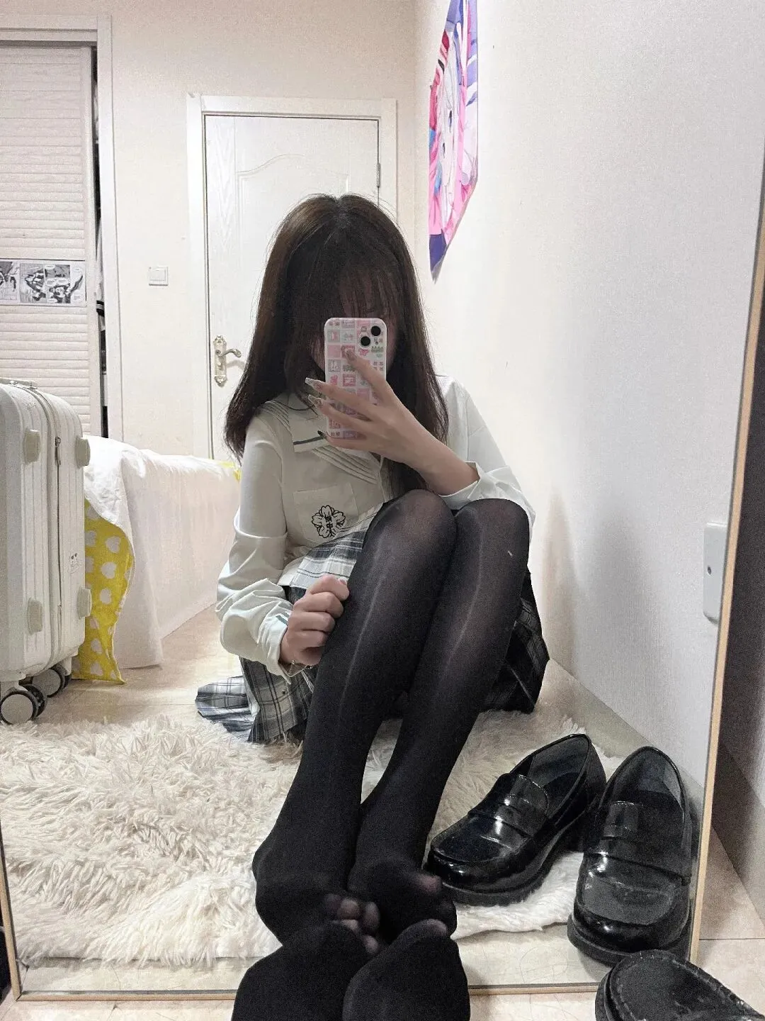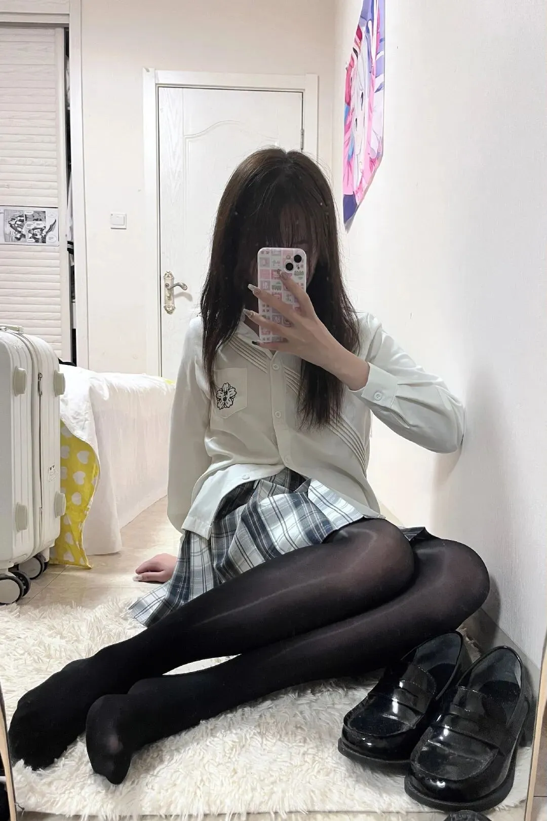 下班回到房间,换上白衬衫配格纹短裙,顺手套上一双黑色丝袜,整个人立刻从打工人切换成校园感少女,镜子里的自己都想多看两眼。